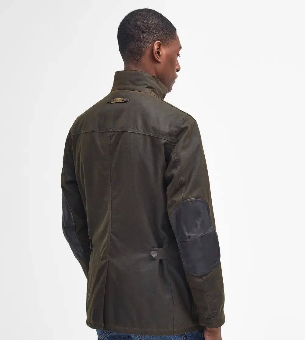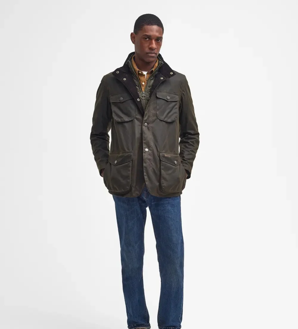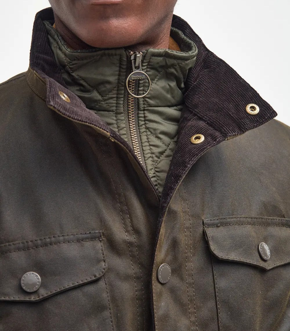 Giacca uomo verde oliva elegante e raffinata, รจ un capo robusto, dal taglio maschile e rilassato, realizzato in cotone cerato, che offre una solida protezione dalle intemperie con una finitura opaca effetto camoscio. Il gilet trapuntato integrato crea un look outdoor e offre un ulteriore strato di calore, chiudendosi fino al collo alto con una zip con logo. La giacca esterna aggiunge ulteriore praticitร con robuste chiusure a bottone e quattro ampie tasche, oltre a dettagli distintivi come toppe in pelle sui gomiti e rivestimenti in velluto a coste. La lussuosa fodera aggiunge un tocco di eleganza e raffinatezza a questa robusta giacca invernale.