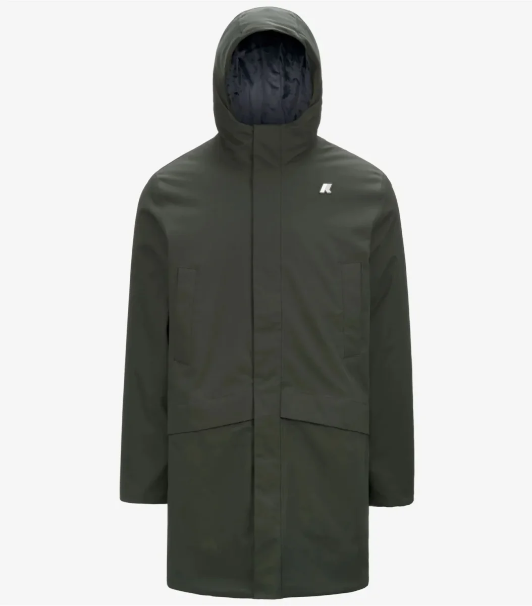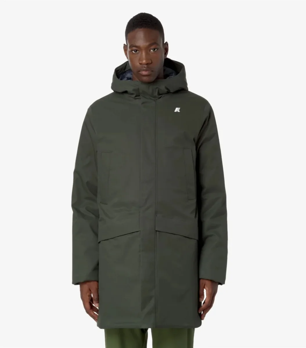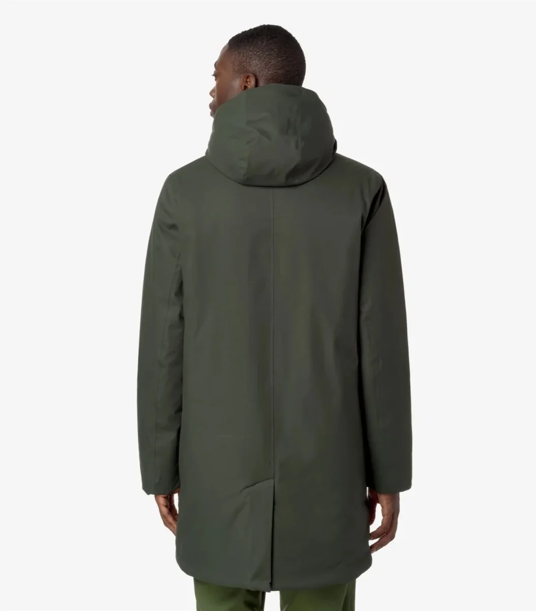 Giubbino lunghezza tre quarti da uomo verde realizzato in twill di poliestereimpermeabile, idrorepellente e antivento, con imbottitura in ovatta peso leggero, che offre un grado di calore medio perfetto per i primi freddi. Modello dotato di cappuccio nokn staccabile regolabile con corda elastica, chiusura con zip coperta dalla patta, polsini con ghetta interna, due tasche scalda-mani sul petto, due tasche con patta e chiusura con snap, logo in silicone bianco. Vestibilitร  regolare.