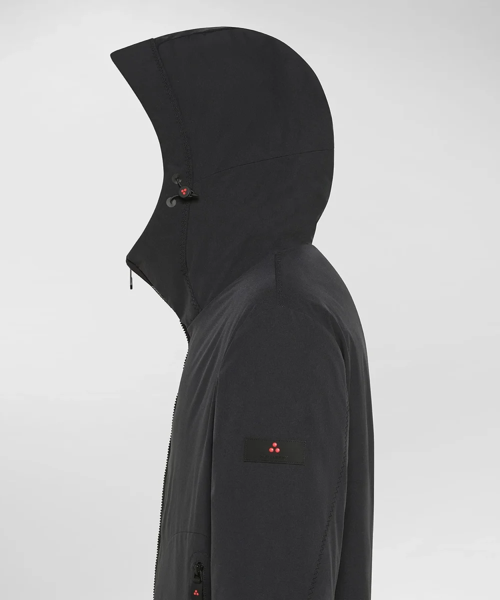Giubbino corto uomo nero realizzato in tela di poliestere stretch accoppiata con un jersey di poliestere soffice e caldo, grazie alla finezza dei filati utilizzati. Lโimbottitura in Thermoplume, valida alternativa sintetica alla piuma dโoca, assicura calore, morbidezza e leggerezza, oltre a una naturale resistenza allโacqua. Il design essenziale e curato include doppia zip centrale pensata per regolare il capo e aggiungere praticitร , tasche laterali a filetto, polsini antivento in maglina nera e cappuccio con tiranti regolabili, per una protezione ottimale.