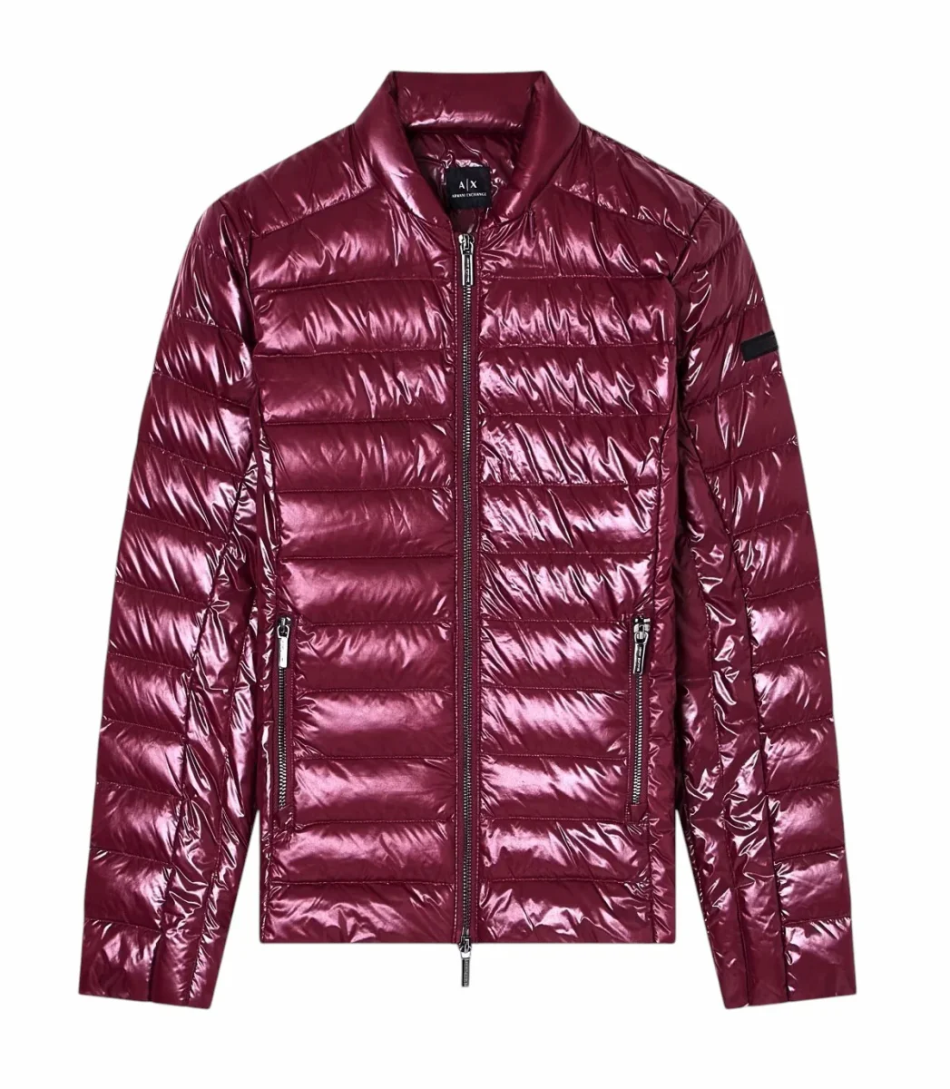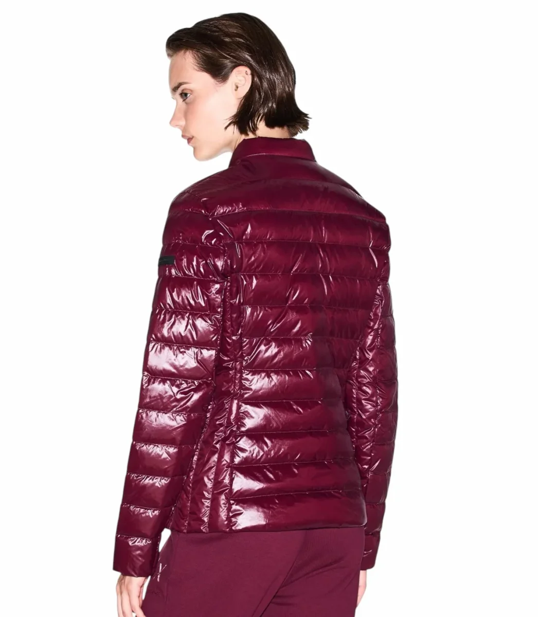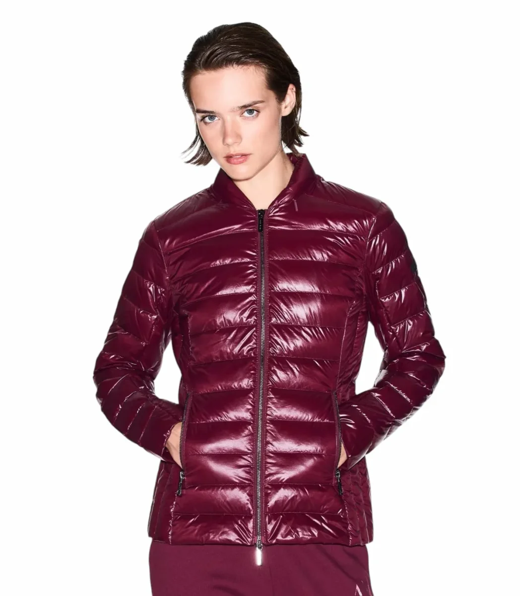 Giubbino donna bordeaux ultraleggero, ralizzato in nylon tecnico con imbottitura leggera ad alto isolamento termico. Caratterizzato da una silhouette sciancrata e dalla trapuntatura orizzontale, รจ facilmente comprimibile e impacchettabile nella sua apposita pochette. Presenta collo a listino, chiusura frontale con zip integrale, due tasche laterali verticali con chiusura zip e patch logo applicato sulla manica.