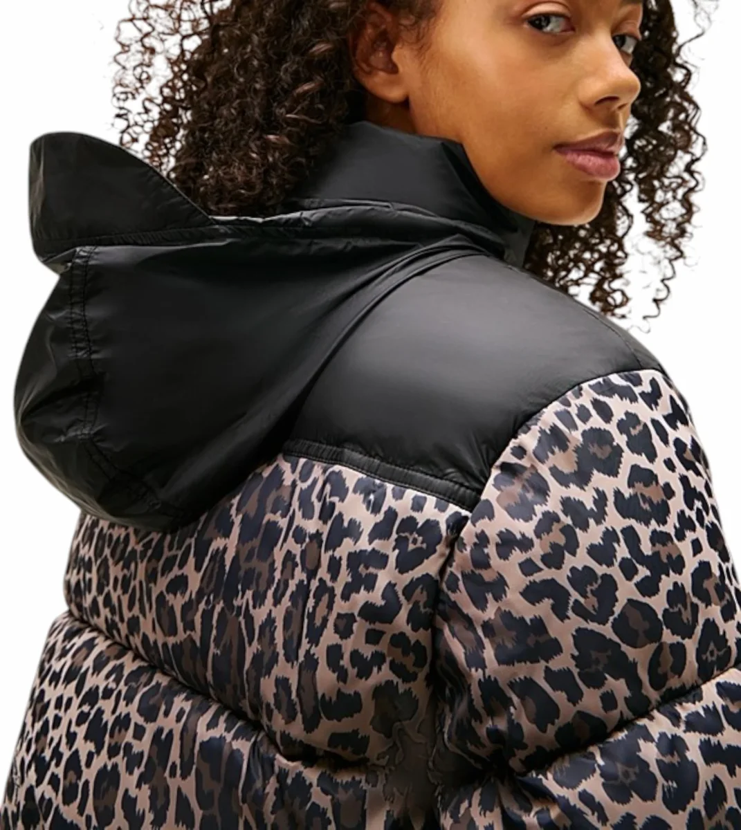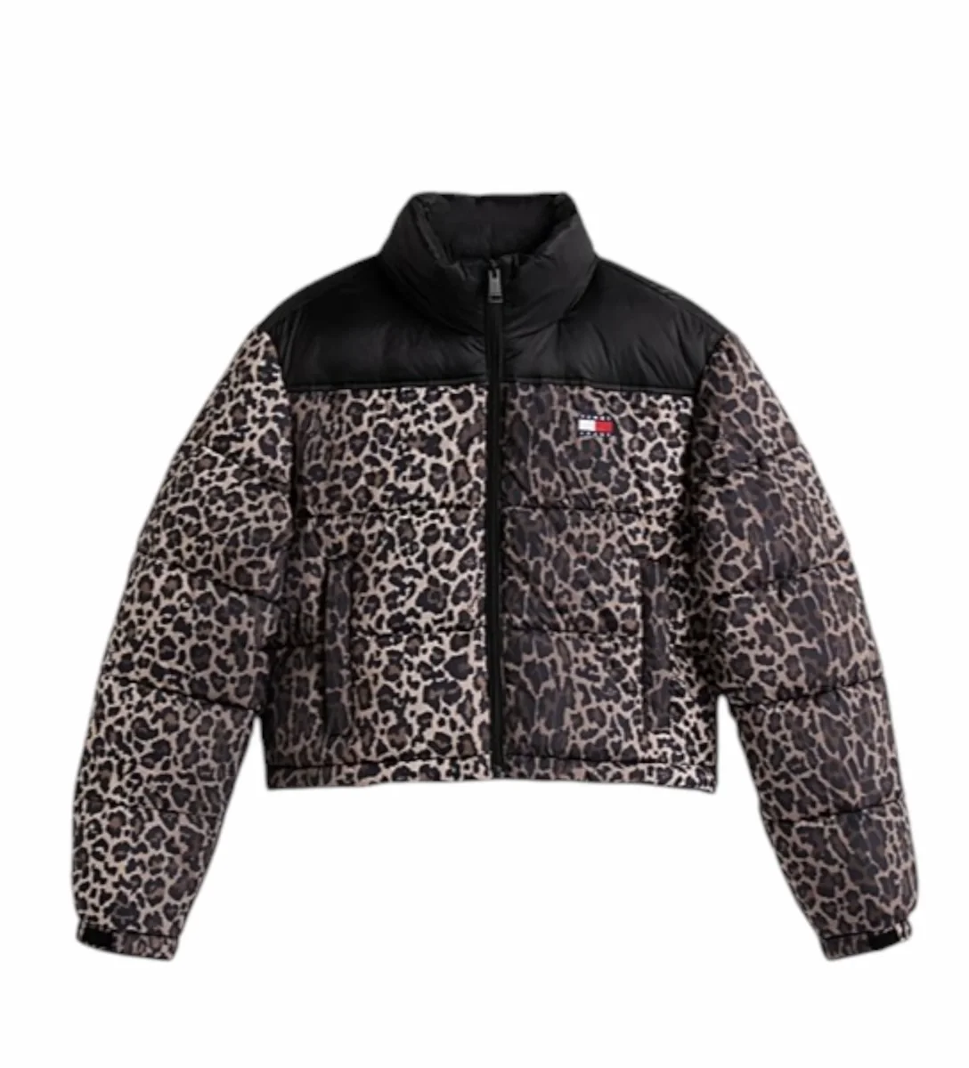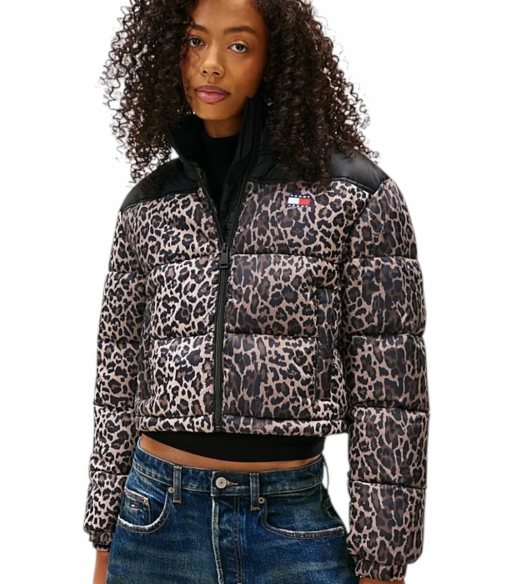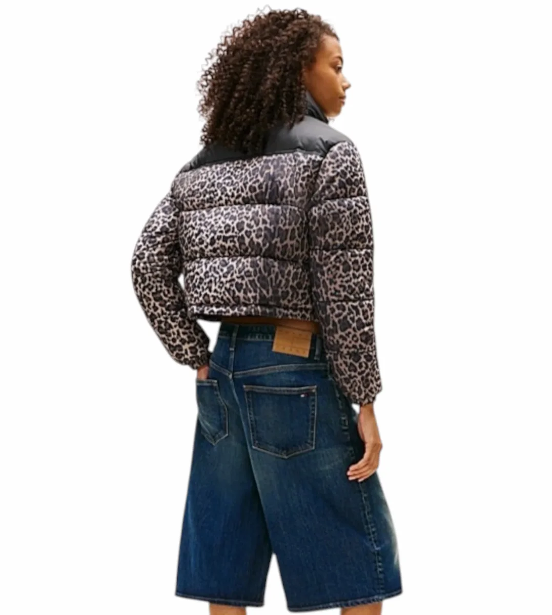 Giubbino donna imbottito, proposto in una moderna versione crop, รจ realizzato in resistente tessuto ripstop idrorepellente e vivacizzato dalla grintosa stampa leopardata.Presenta un collo a imbuto, chiusura zip integrale, due tasche con zip sul davanti e logo sul petto. Vestibilitร rilassata.