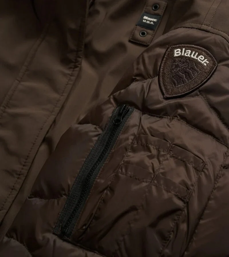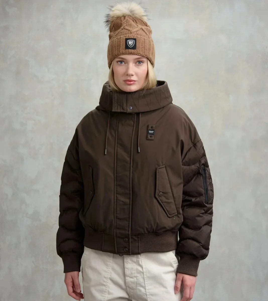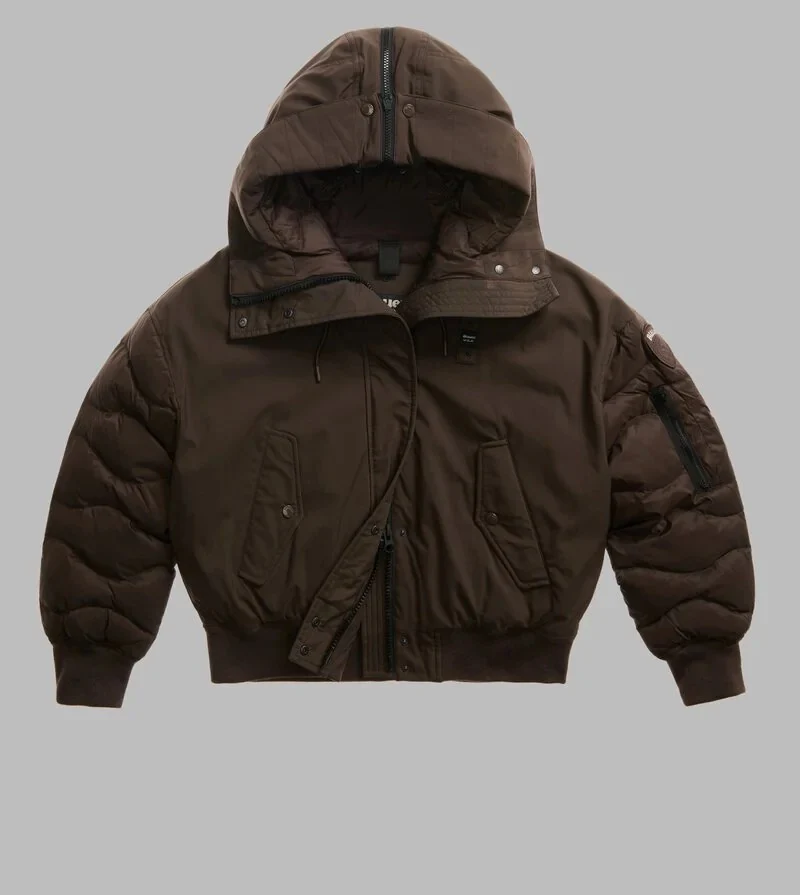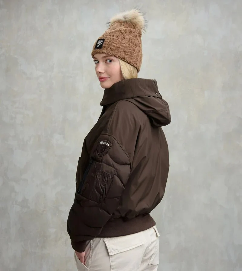 Giubbino donna marrone castagna, realizzato in neoprene e nylon lucido. Modello bomber di ispirazione militare, con cappuccio diviso da zip centrale, imbottito in piumino, chiusura con zip e bottone, tasca con zip e portapenne, orlo e polsini a costine, logo ricamato sul profilo del cappuccio e patch con logo.