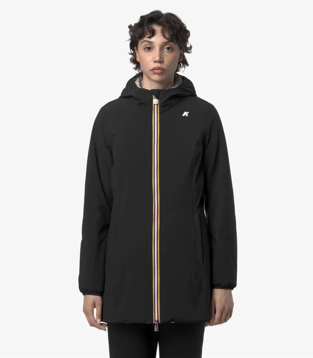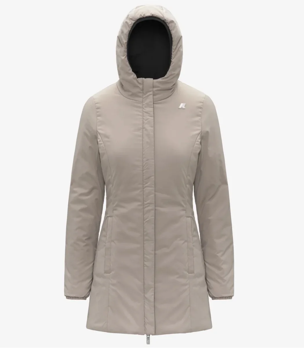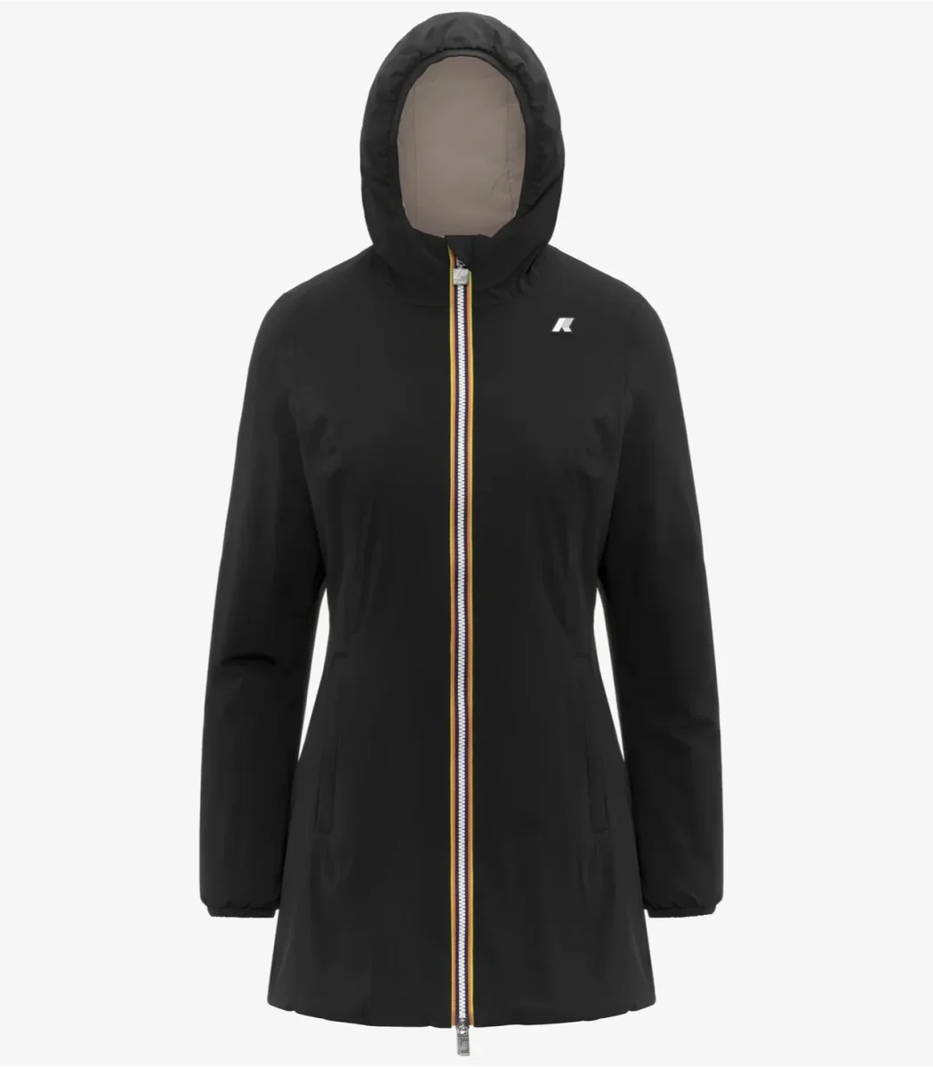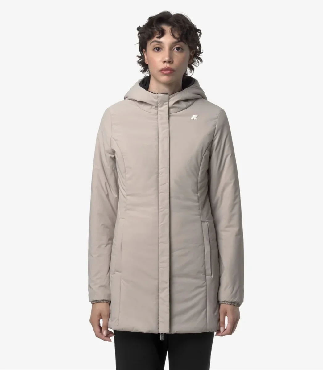 Giubbino reversibile donna nero/beige, con lunghezza a tre quarti che combina un lato in poliestere elasticizzato impermeabile tinta unita e un lato in poliestere antivento dal colore a contrasto, con imbottitura in ovatta di peso medio, ideale per la mezza stagione. Modello dotato di cappuccio regolabile con corda elastica, chiusura con zip, polsi con elastico, due tasche con zip, due tasche con bottoni a pressione e logo in silicone bianco. Vestibilitร slim.