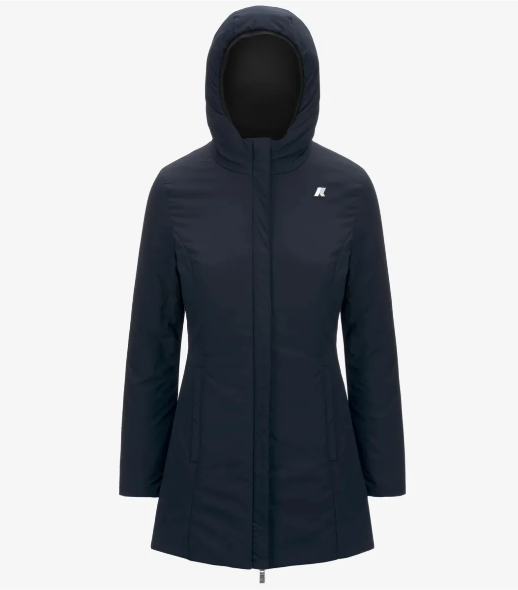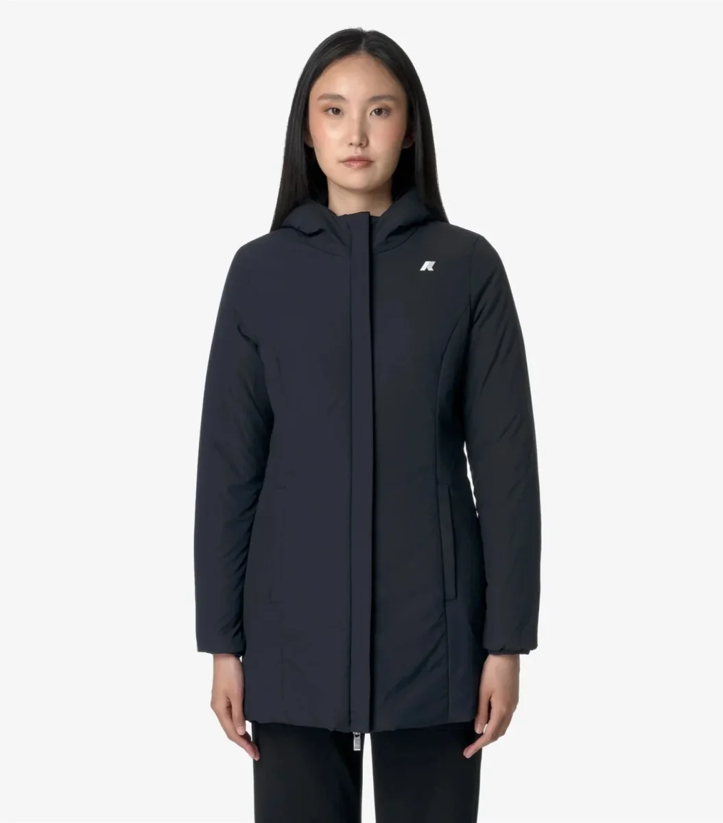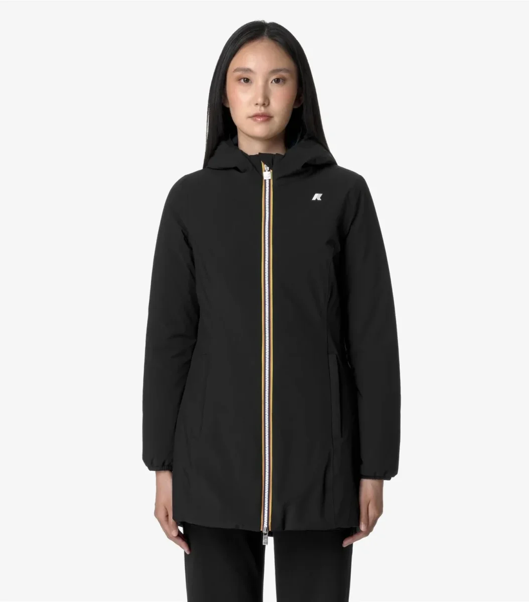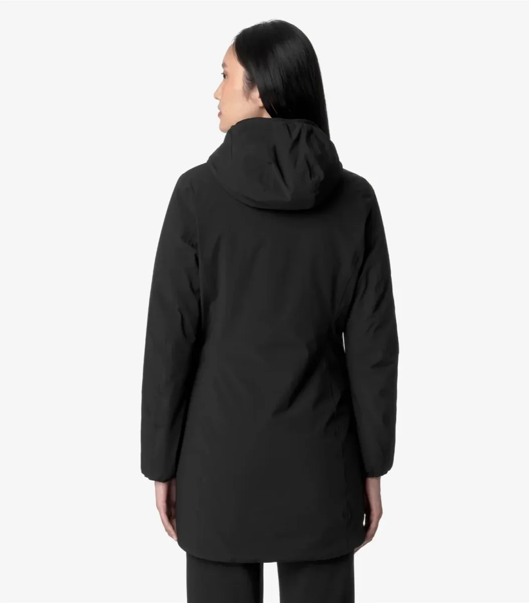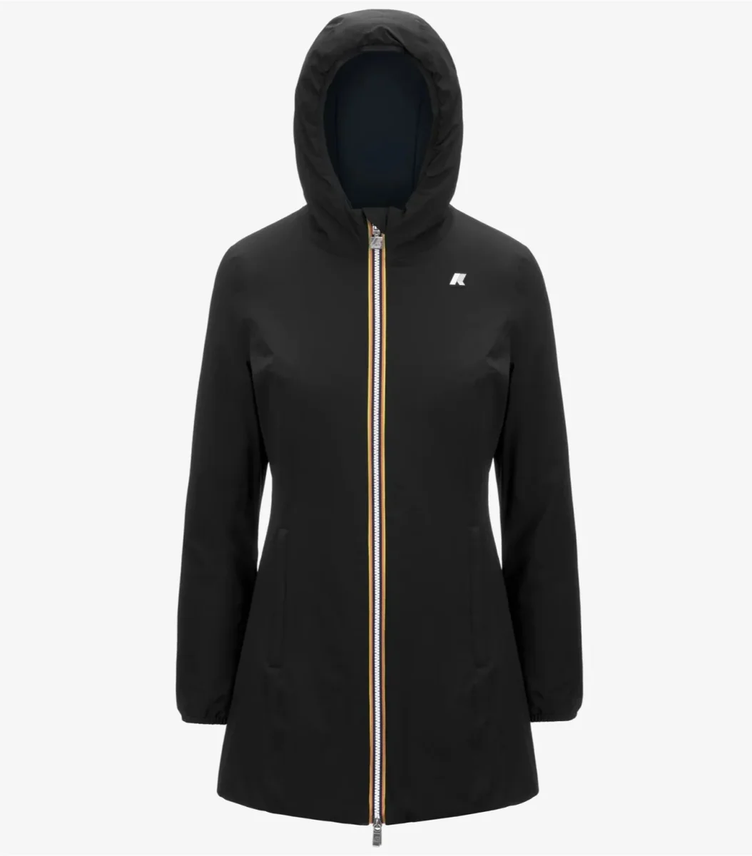 Giubbino reversibile donna nero/blu, con lunghezza a tre quarti che combina un lato in poliestere elasticizzato impermeabile tinta unita e un lato in poliestere antivento dal colore a contrasto, con imbottitura in ovatta di peso medio, ideale per la mezza stagione. Modello dotato di cappuccio regolabile con corda elastica, chiusura con zip, polsi con elastico, due tasche con zip, due tasche con bottoni a pressione e logo in silicone bianco. Vestibilitร slim.
