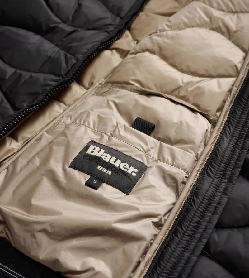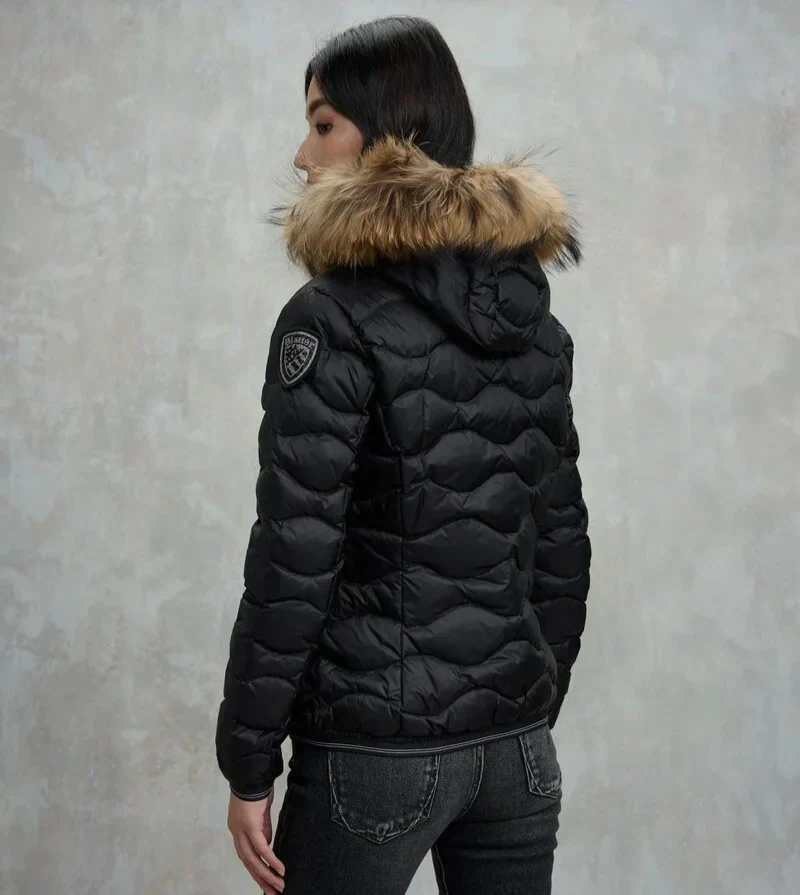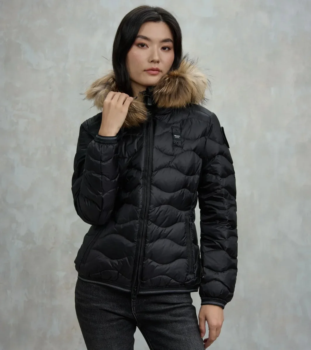 Giubbino donna nero, in nylon idrorepellente con trapuntatura a onde orizzonatli e bordo cappuccio in vera piuma. Presenta chiusura con zip nascosta, copricerniera al collo, tasche con zip, elastico a costine sul fondo e polsini, patch glitter con logo.