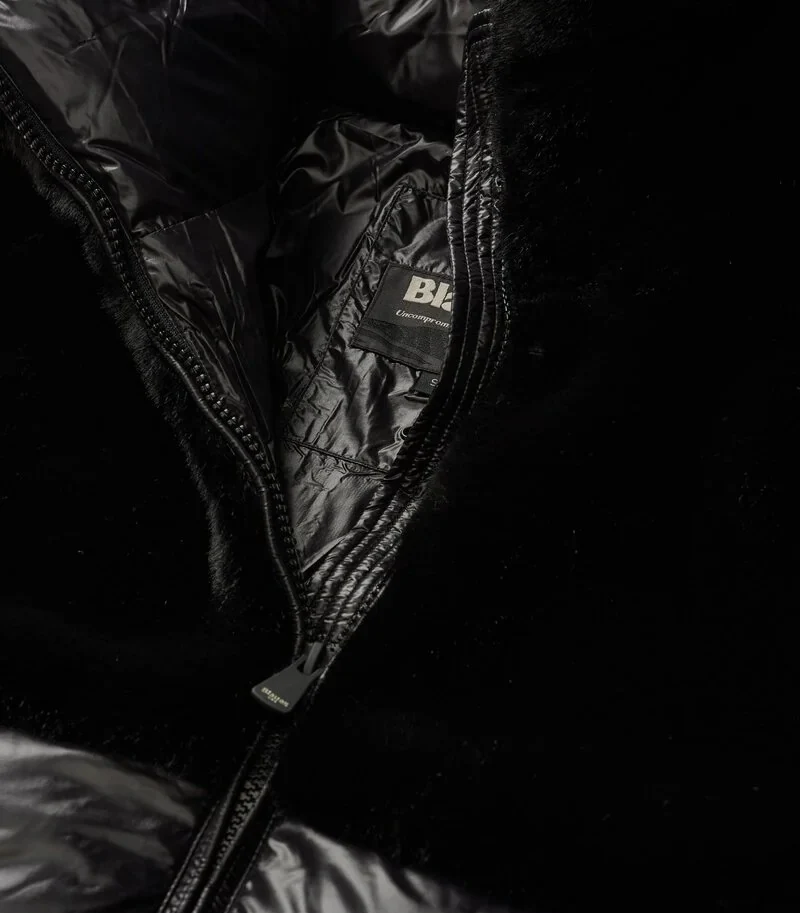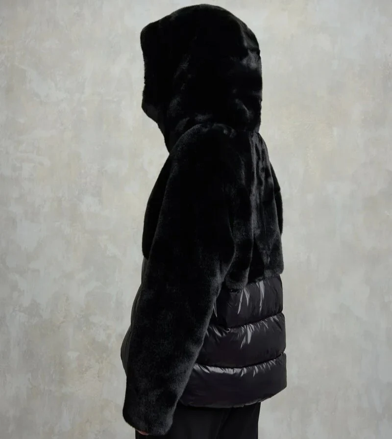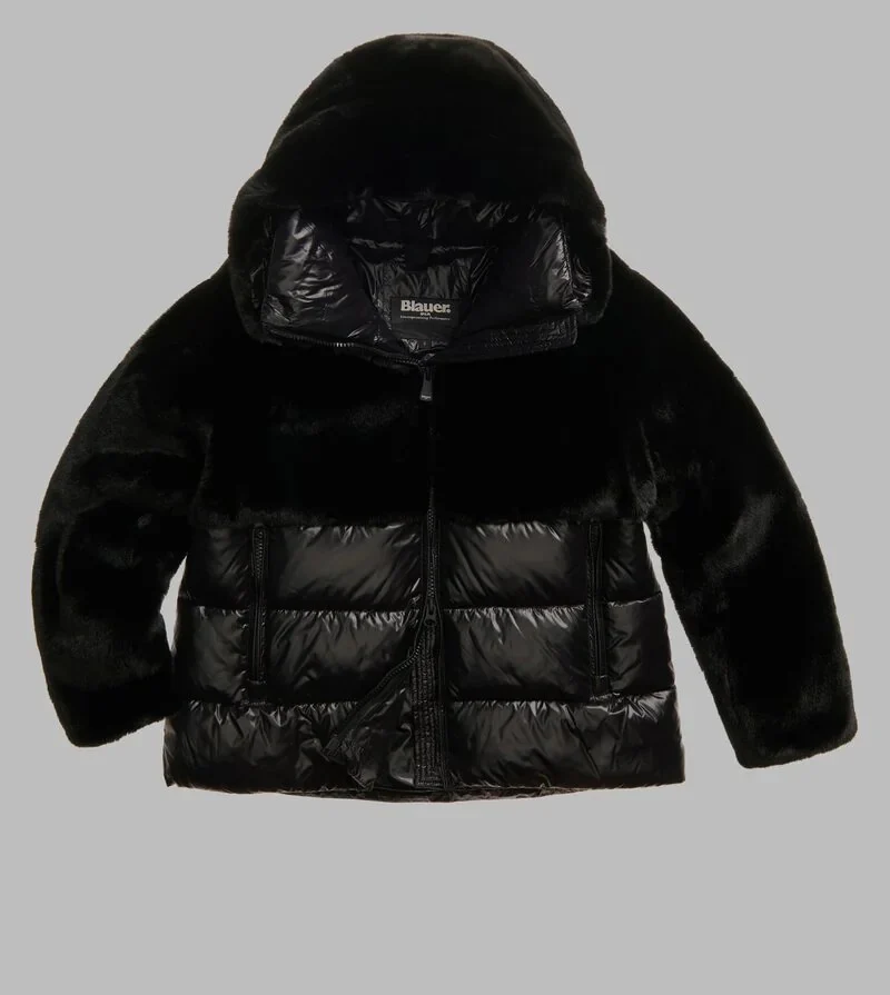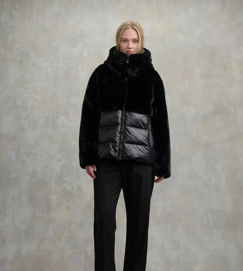 Giubbino donna nero in eco-pelliccia nella parte superiore e nylon lucido in quella inferiore. Caldo cappuccio fisso con coulisse, con trapuntatura a righe orizzontali nella parte inferiore, chiusura con zip, con tasche con zip e copricursore, doppio plsino con elastico interno, coulisse al fondo e tasche interne con velcro.
