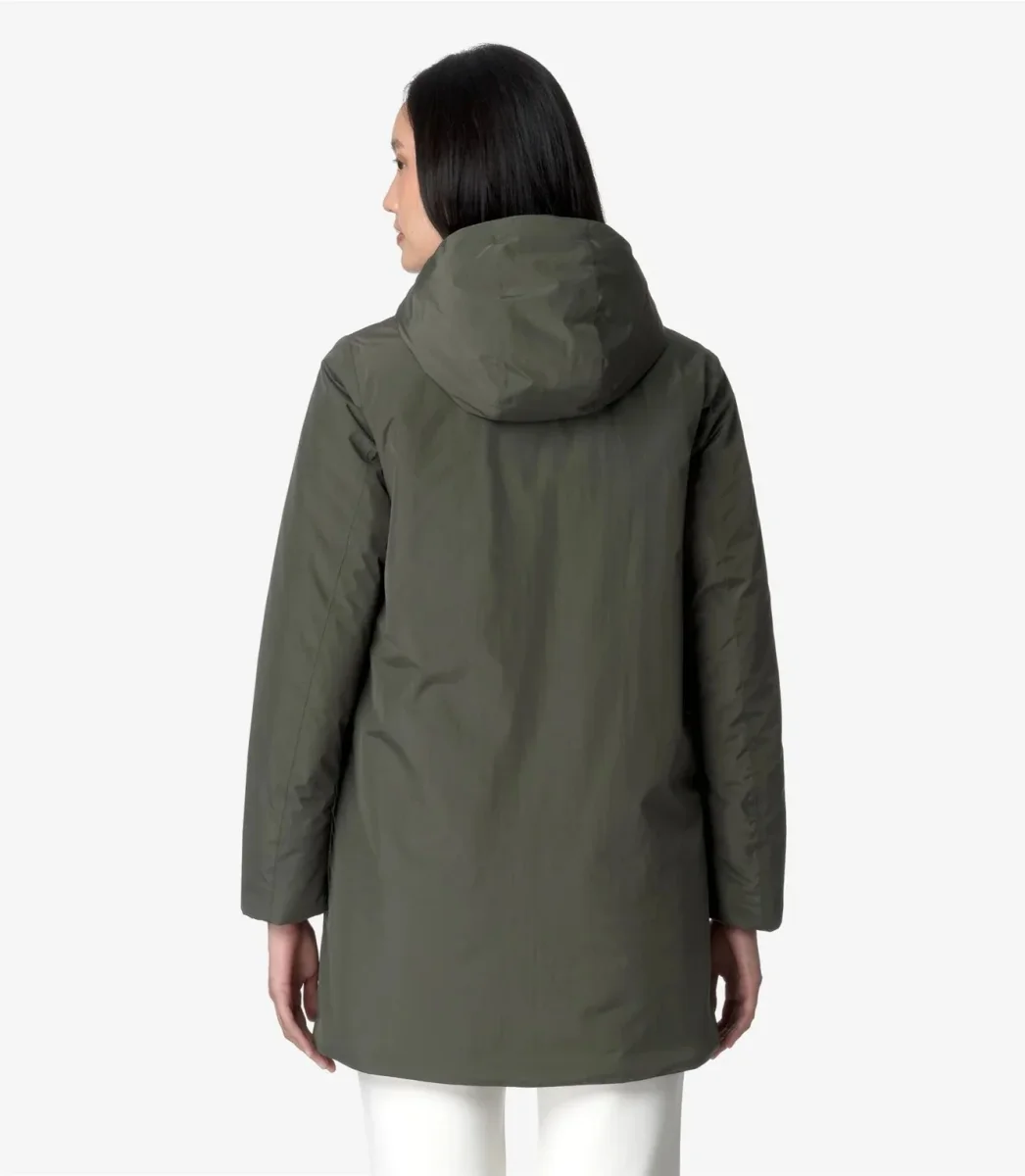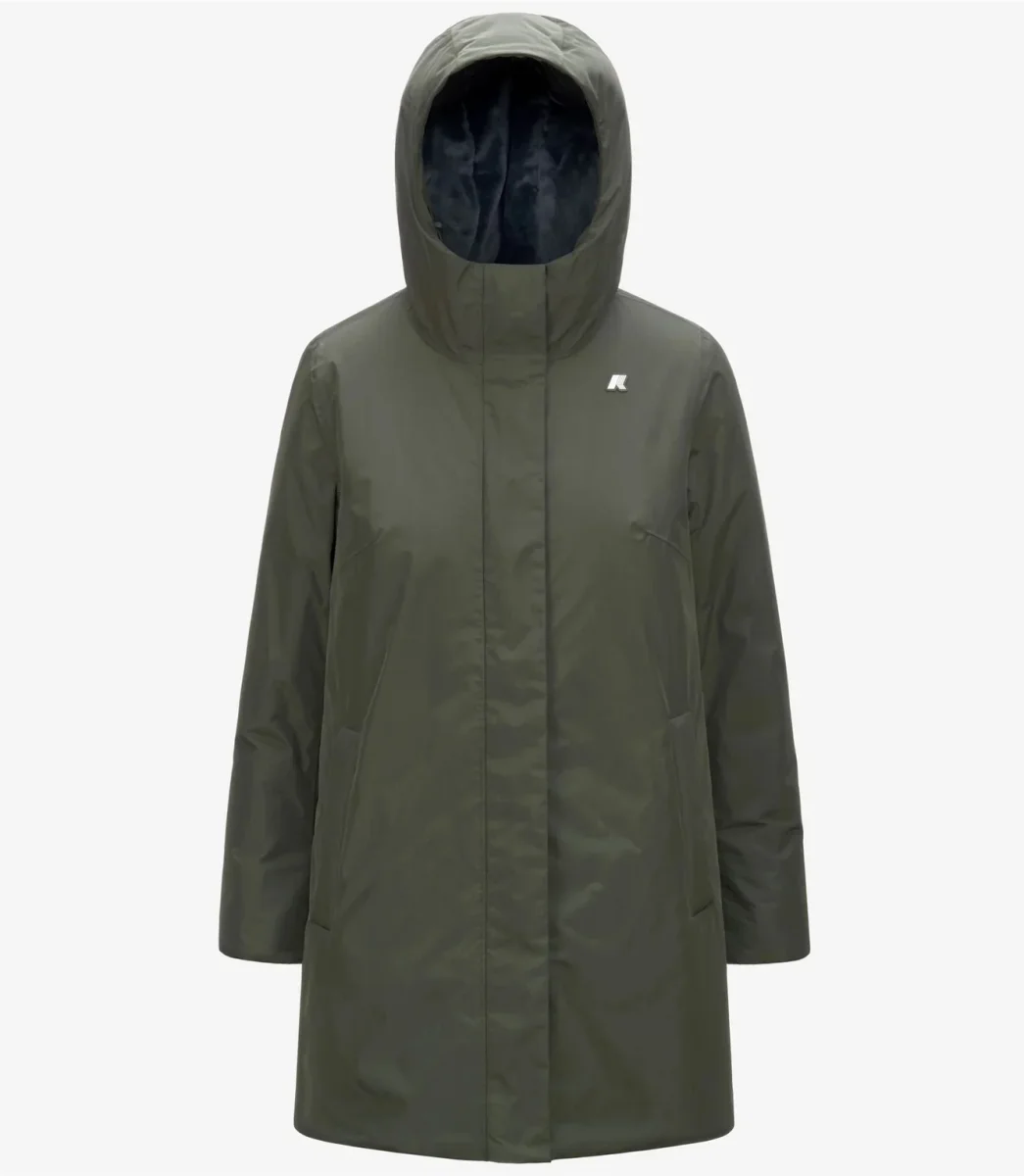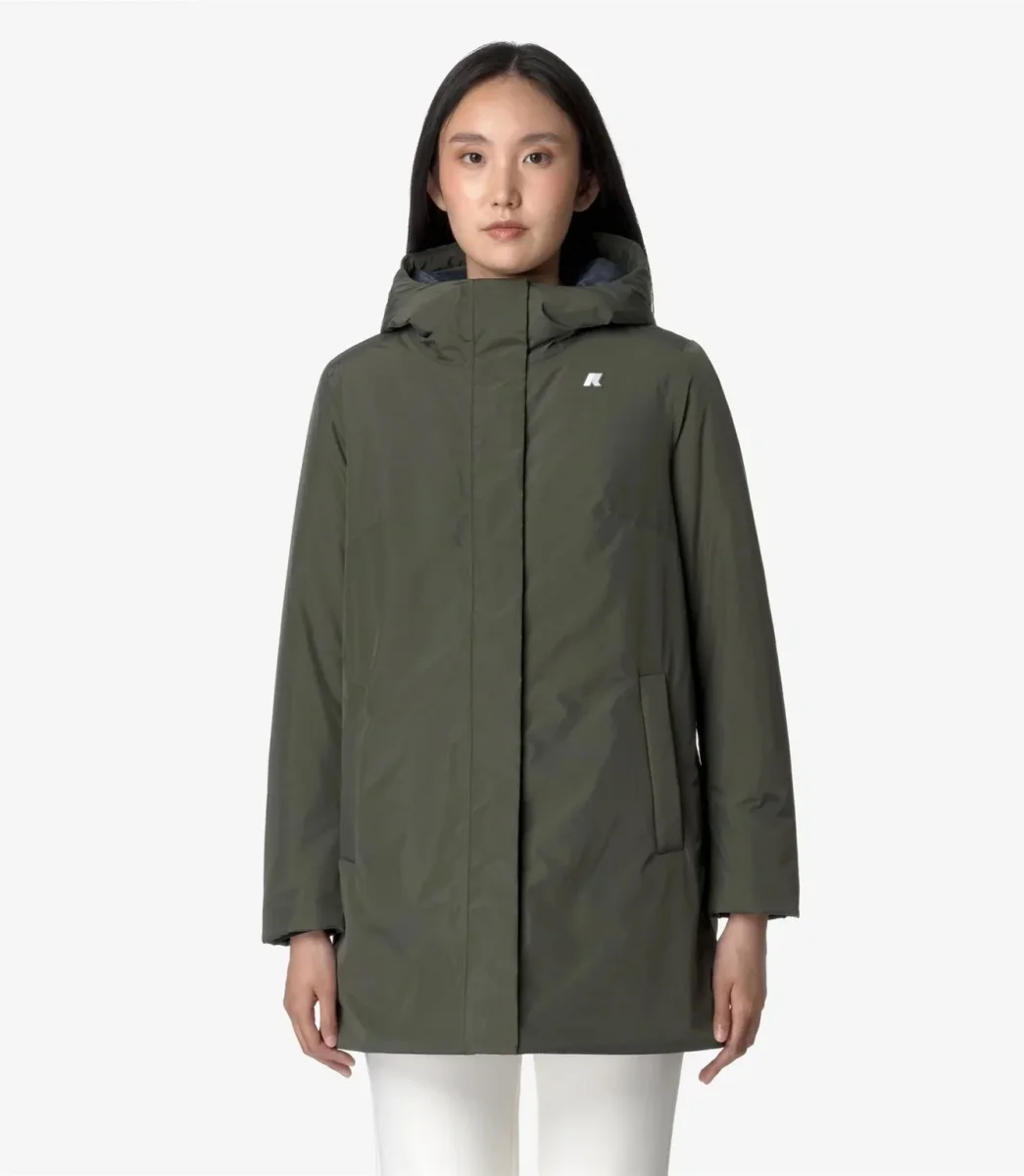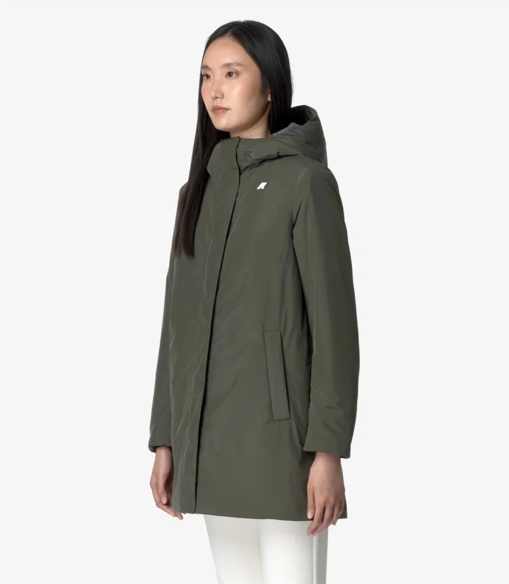 Giubbino donna verde in tessuto impermeabile e antivento, imbottitura in ovatta peso leggero. Modello di media lunghezza che si caratterizza per la linea slim e femminile e il grado di calore medio, ideale per la mezza stagione. I polsi elastici e la chiusura con zip coperta proteggono dal vento, mentre le coulisse permettono di personalizzare la vestibilitร , cappuccio non staccabile regolabile con corda elastica e fermacorda. Logo applicato in silicone bianco.