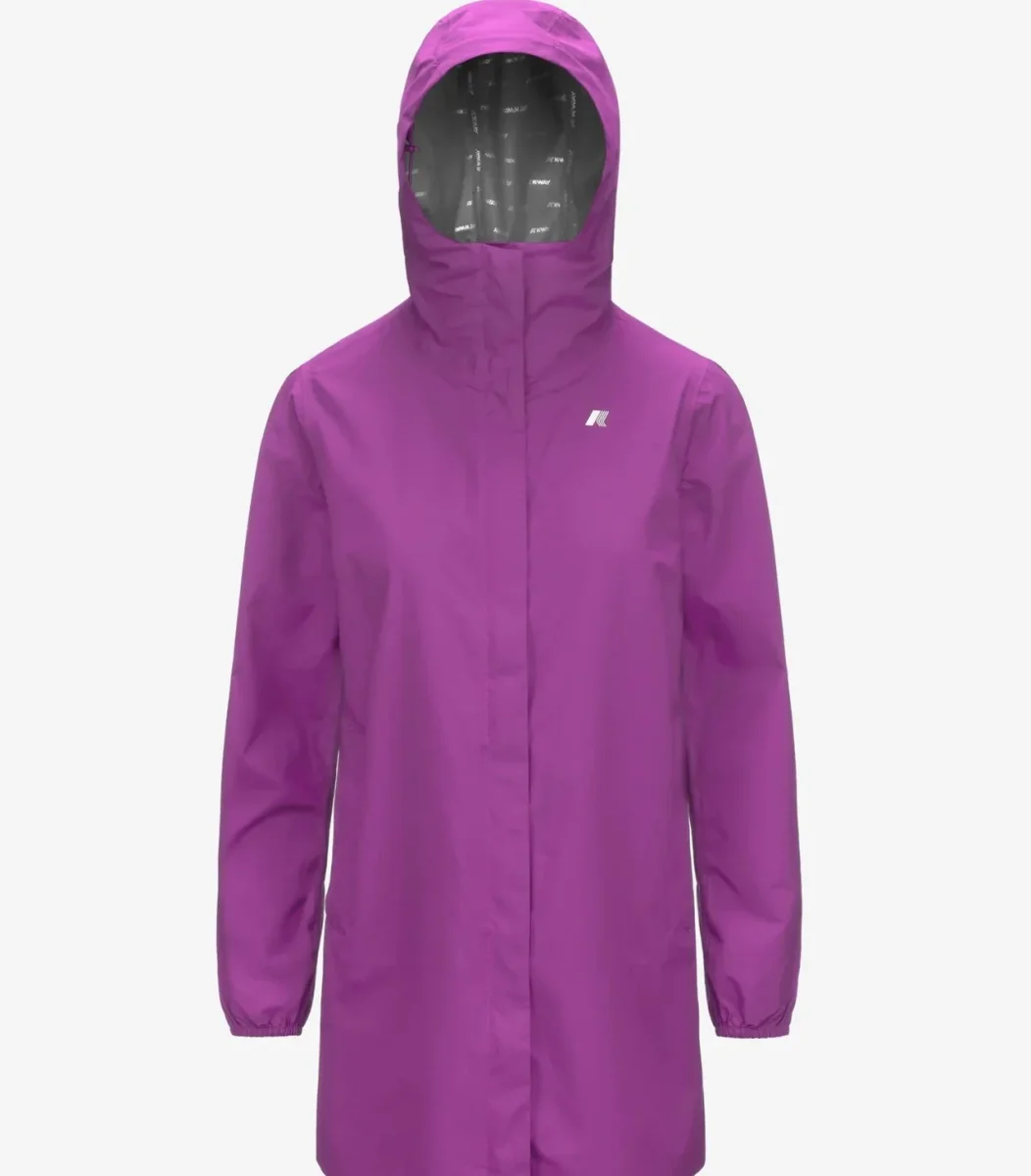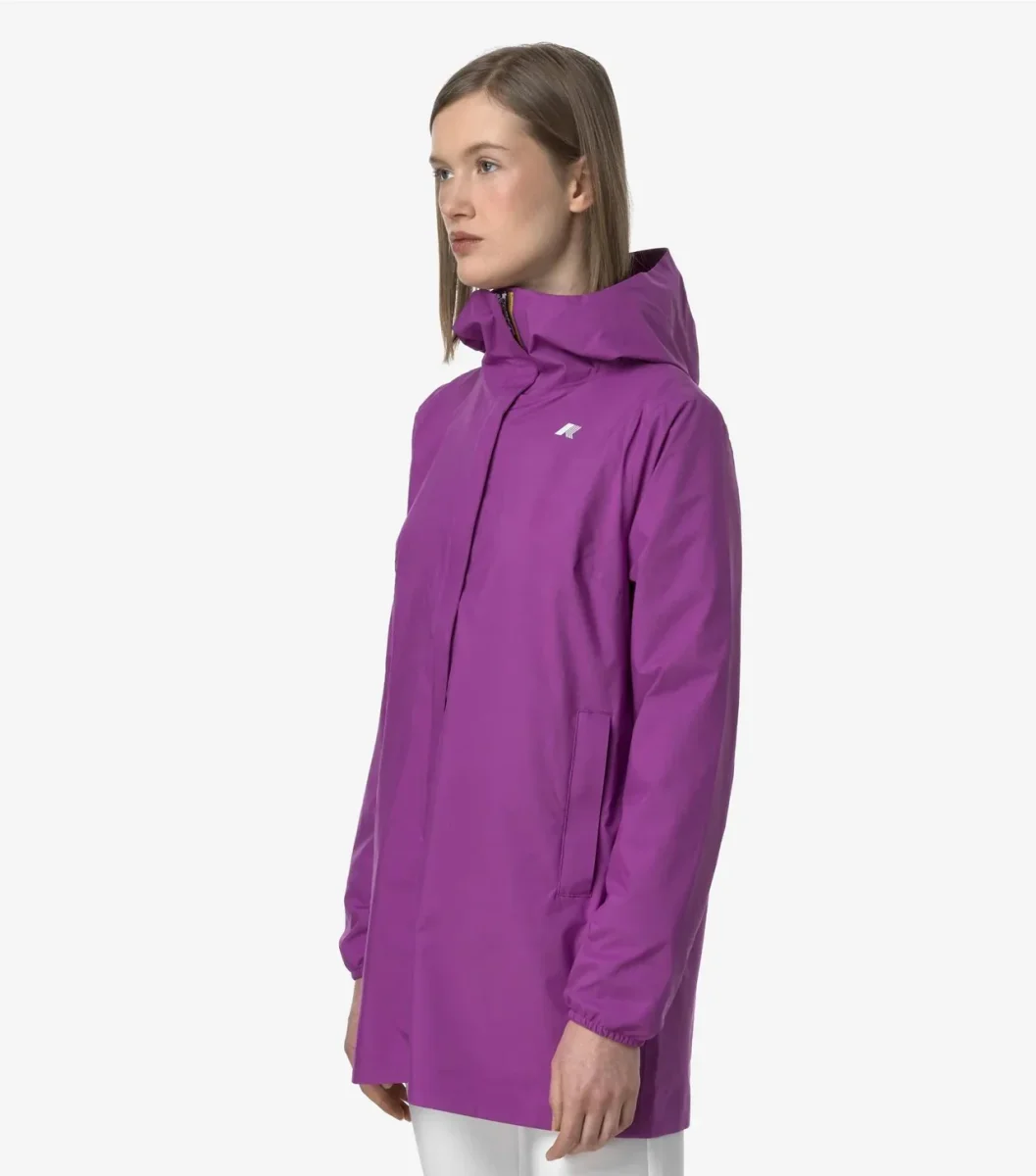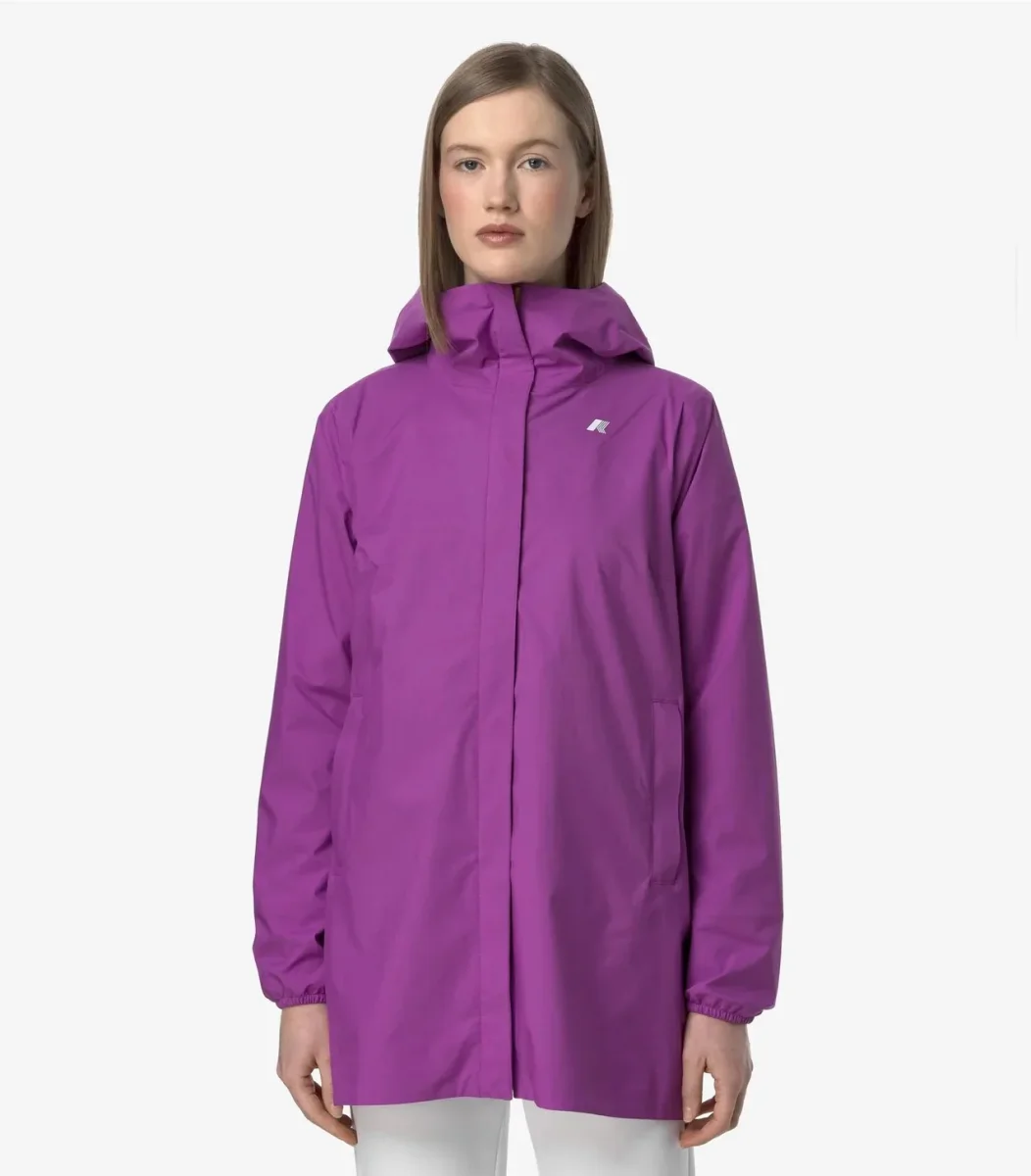 Giubbino donna viola dalla lunghezza a tre quarti e vestibilitร slim, ideale per le mezze stagioni, realizzata in tessuto tecnico elasticizzato, impermeabile, antivento e traspirante. L’interno รจ foderato con una membrana isolante decorata con lettering K-Way stampato all over in tonalitร argento. Le tasche laterali con zip, il cappuccio avvolgente e regolabile, i polsini elastici sono dettagli funzionali che garantiscono aderenza e una vestibilitร comoda e veloce. Logo stampato bianco. Disponibile nelle taglie dalla S alla L.