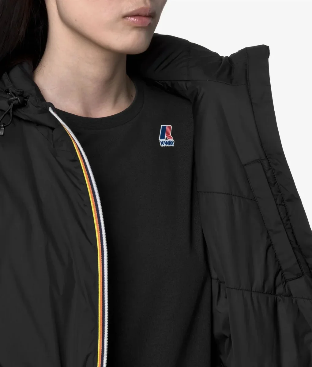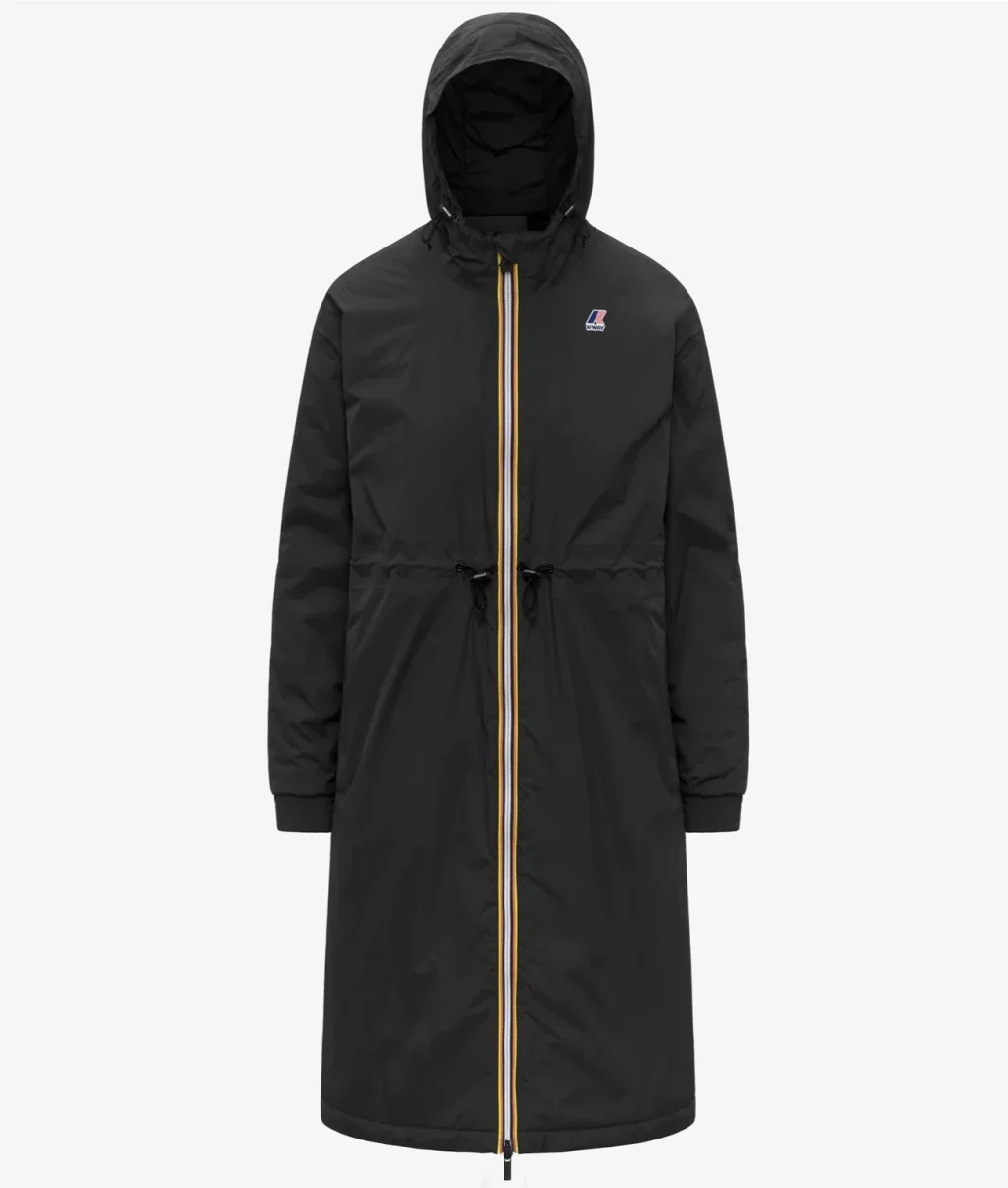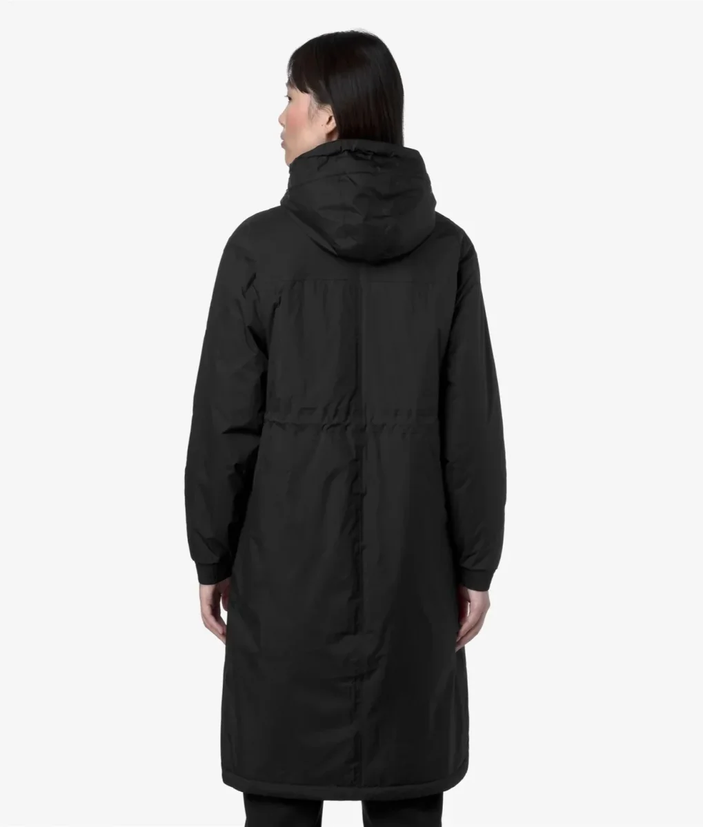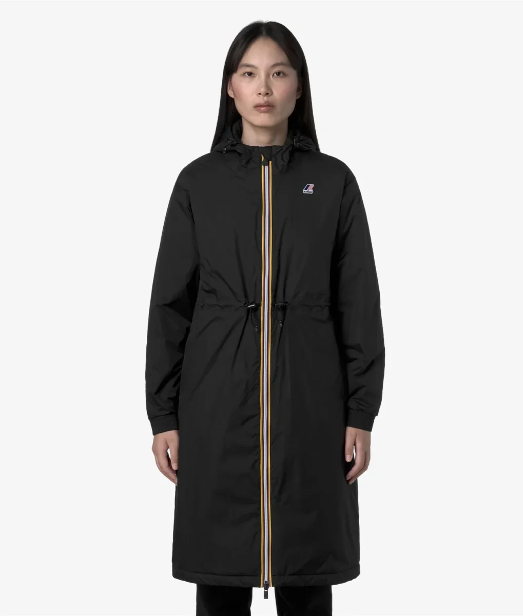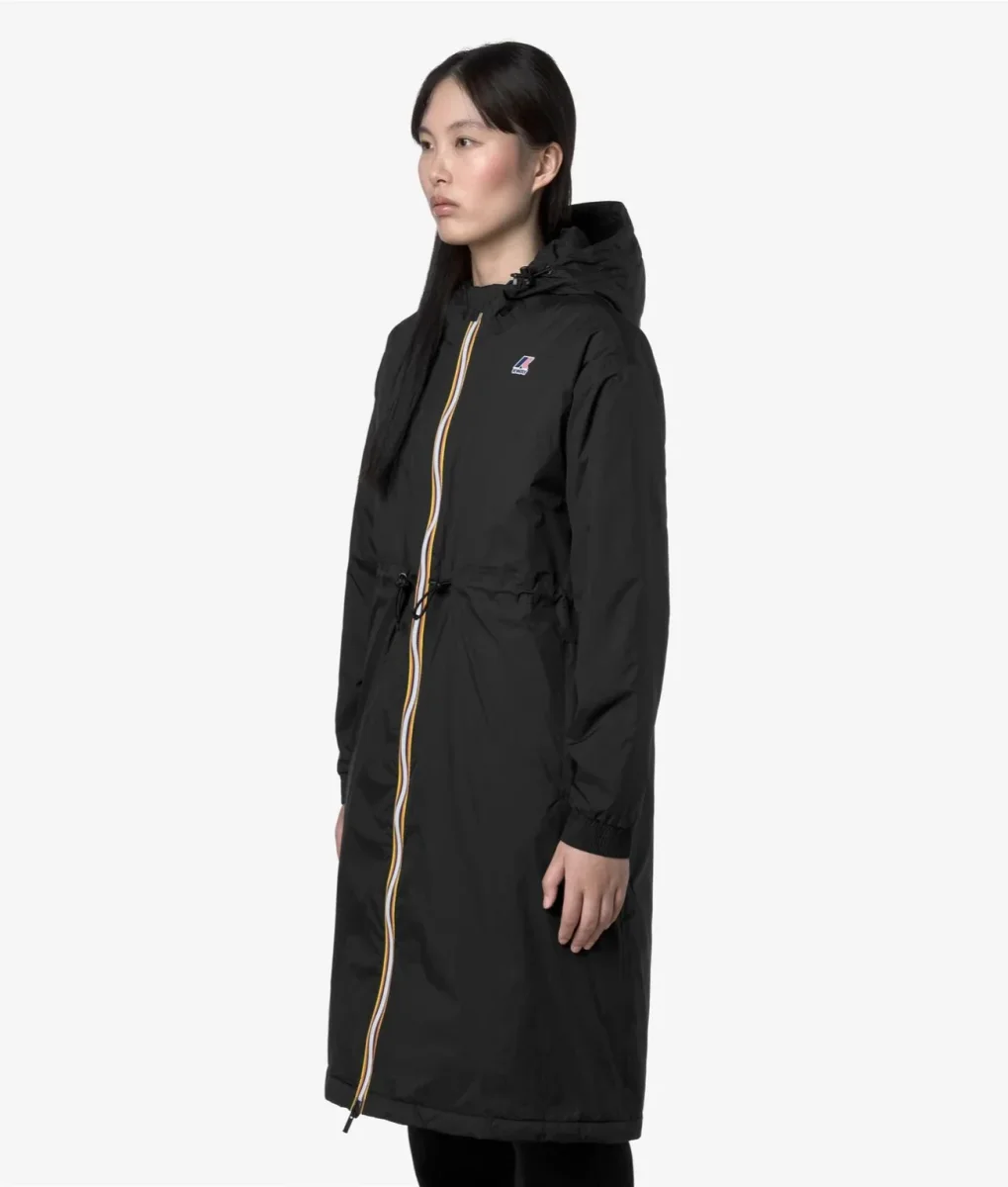 Giubbino lungo da donna nero, progettato per le mezze stagioni, realizzato in tessuto micro ripstop, 100% riciclato, impermeabile, idrorepellente, antivento e trspirante, ha un design sportivo ed essenziale con coulisse in vita per un fit che segue la silhouette. Lโinterno presenta un’imbottitura leggera in PrimaLoftยฎ, una fibra riciclata ricavata dal poliestere e altamente isolante, che protegge senza ingombrare. Modello caratterizzato da chiusura full zip con patta antivento, polsi con elastico, due tasche con zip, tasca interna e logo stampato colorato.