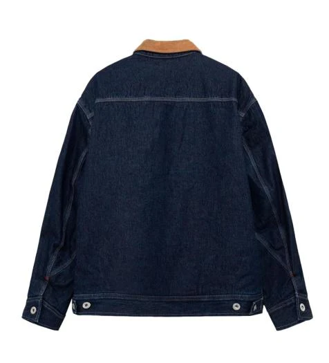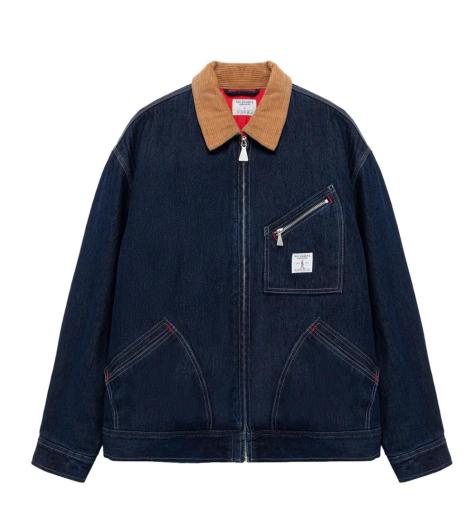 Giacca da lavoro uomo in denim lavaggio scuro con impunture a contrasto, colletto in velluto a costine, chiusura con zip e tirazip logato. Tasche frontali asimmetriche e tasca sul petto con zip e label applicata. Regular fit. Composizione: 100% cotone.