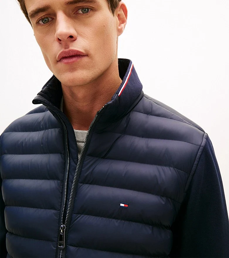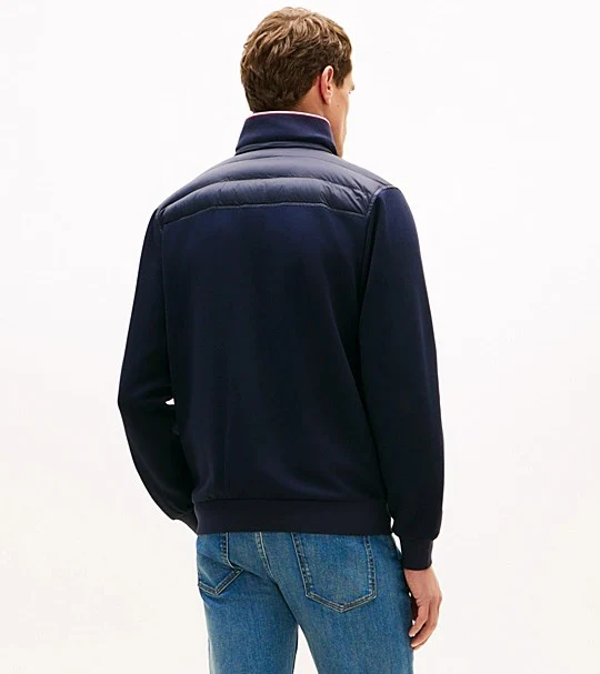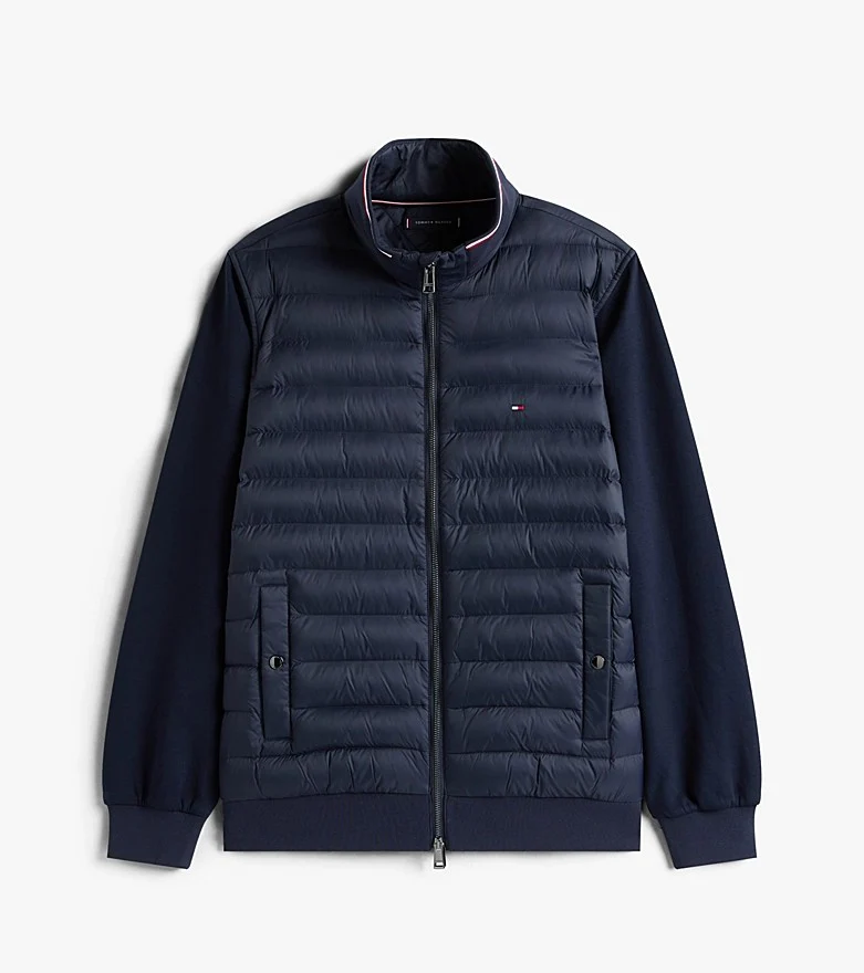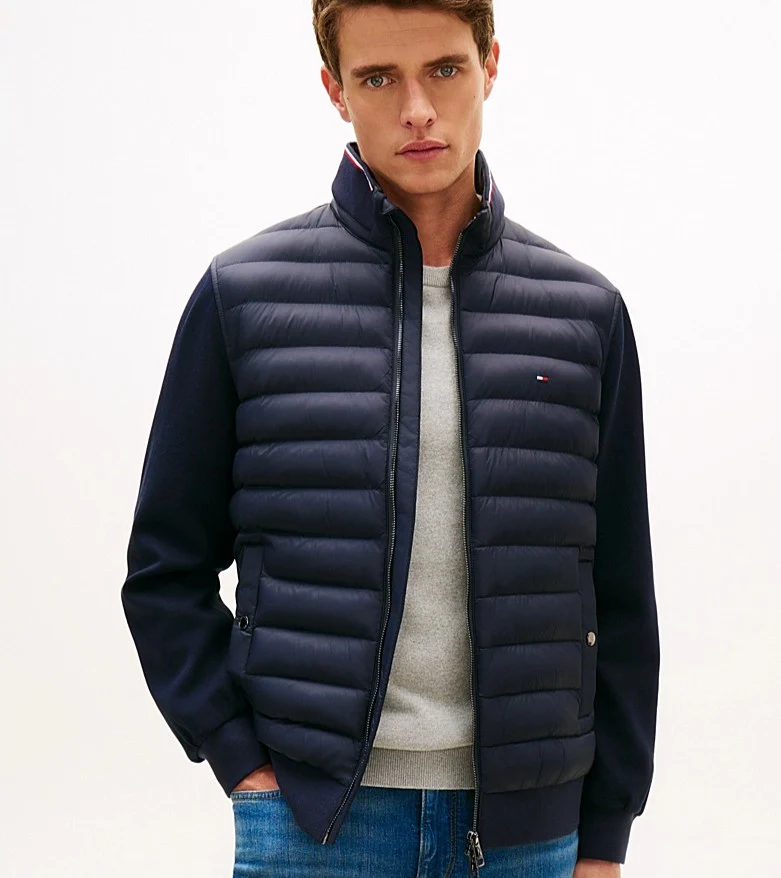 Giubbino uomo blu realizzato in misto cotone, modello caratterizzato da un design con mix di texture: maniche e retro in maglia tecnica e davanti trapuntato; chiusura con zip integrale a doppio cursore, collo a listino e due tasche a filetto con bottone automatico in vita.