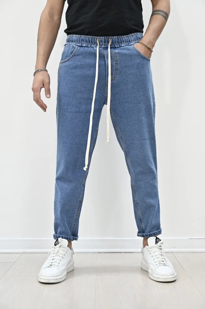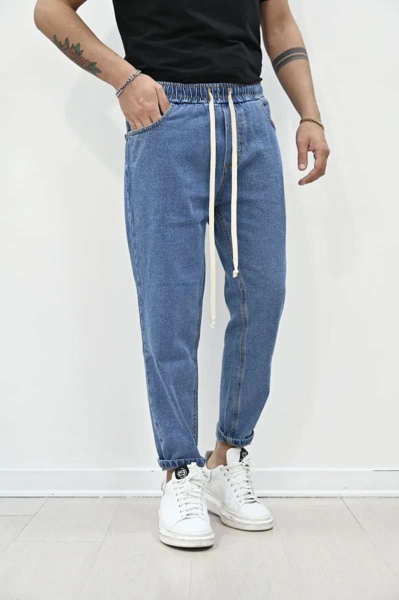 Il modello รจ alto 1,75 cm, pesa 73 kg e indossa una taglia M. Jeans jogger con elastico in vita Vestibilitร : Regolare Composizione: 100% cotone Realizzato in Italia