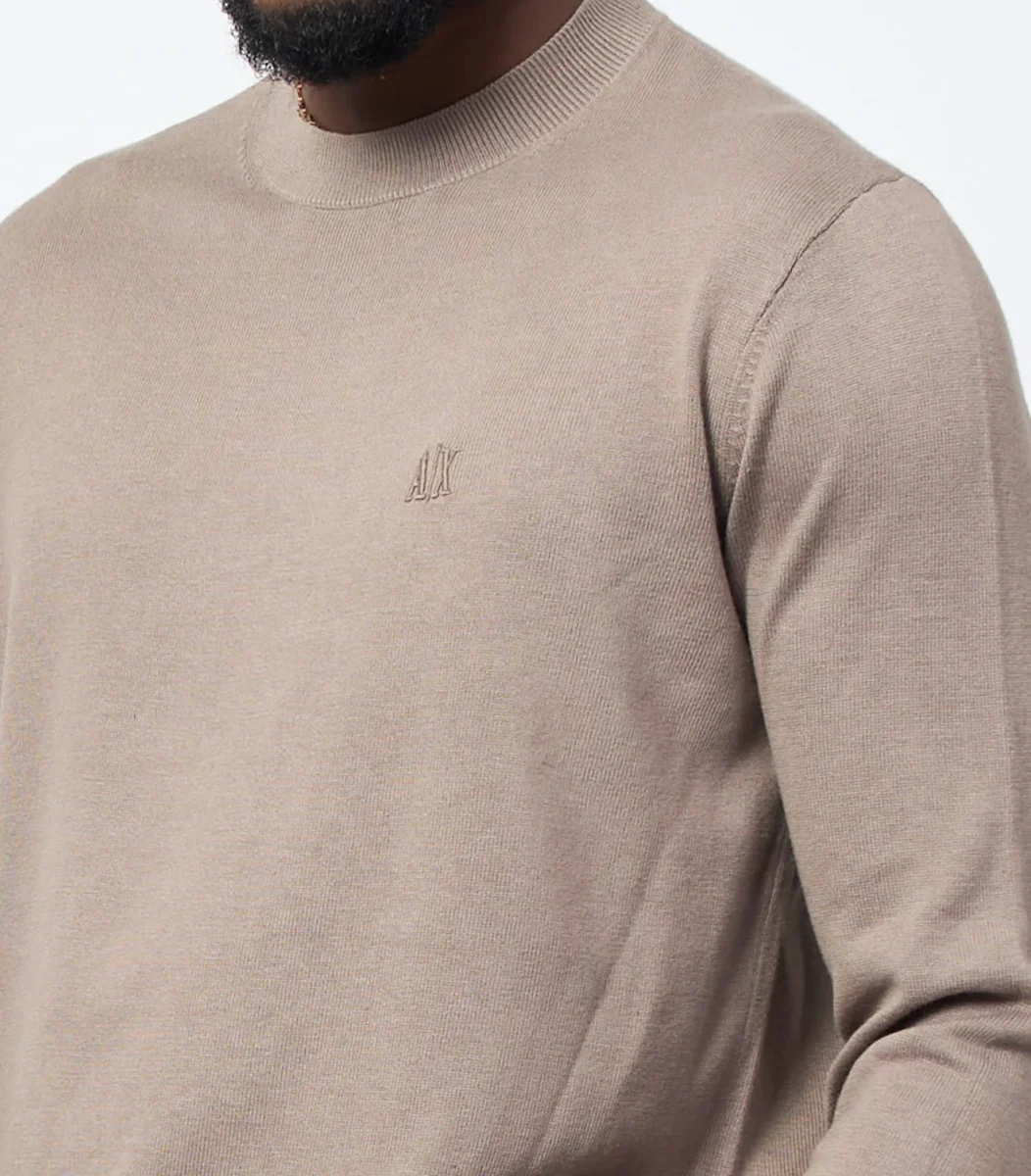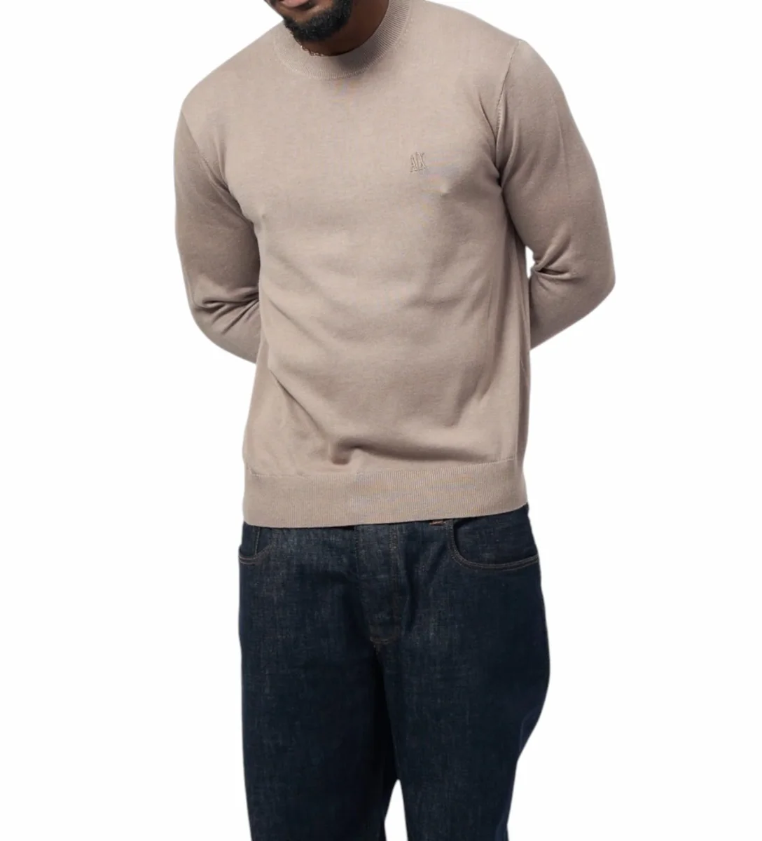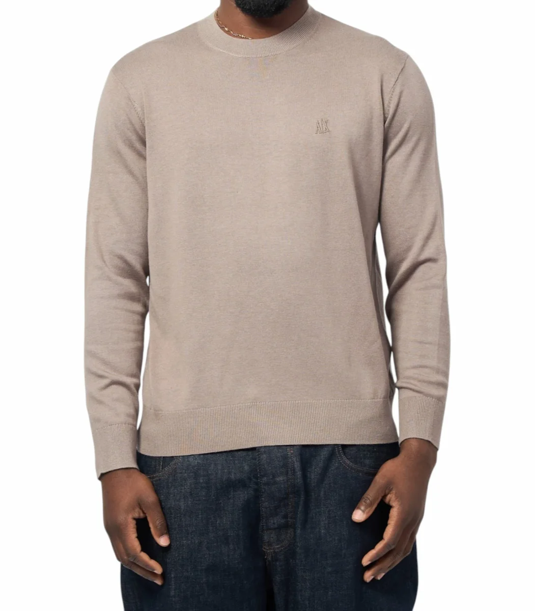Maglia uomo beige in misto cotone, maniche lunghe, girocollo con logo ricamato sul petto.