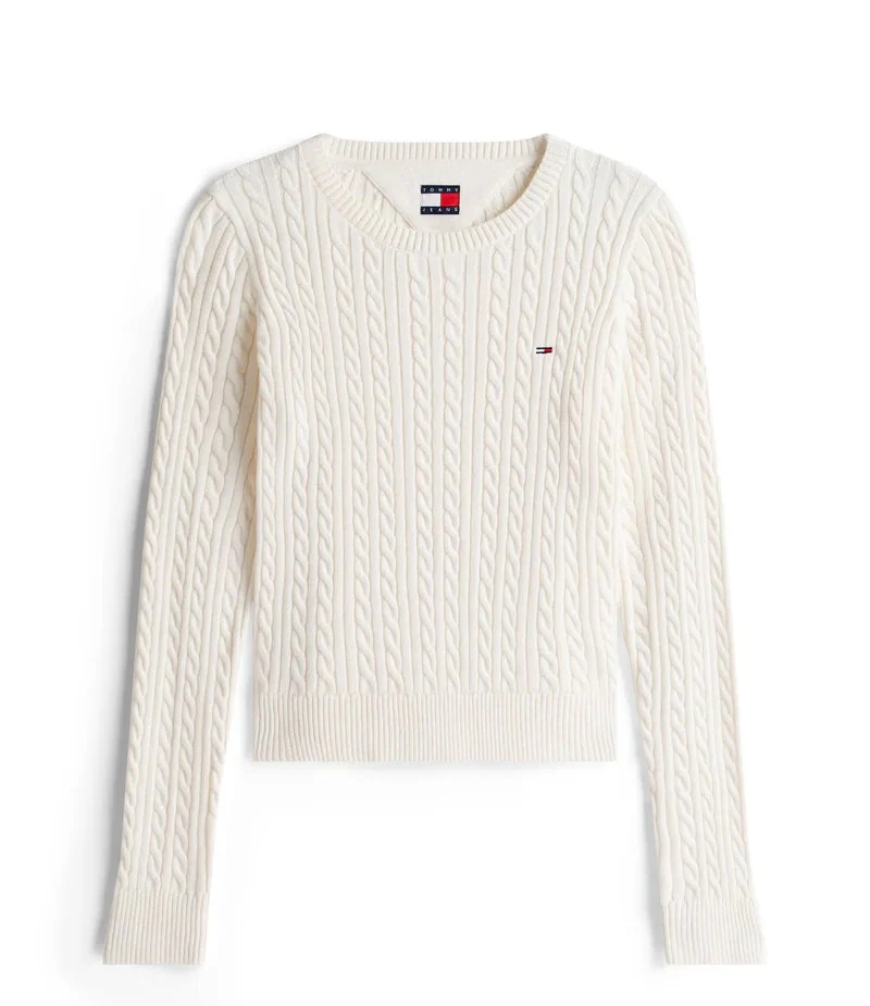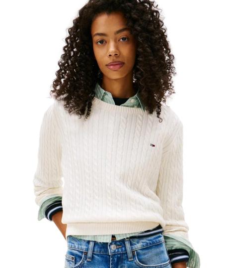 Maglia girocollo donna avorio realizzata in cotone, con lavorazione a trecce, girocollo, polsini e fondo a coste garantiscono una vestibilitร comoda, logo ricamato sul petto.