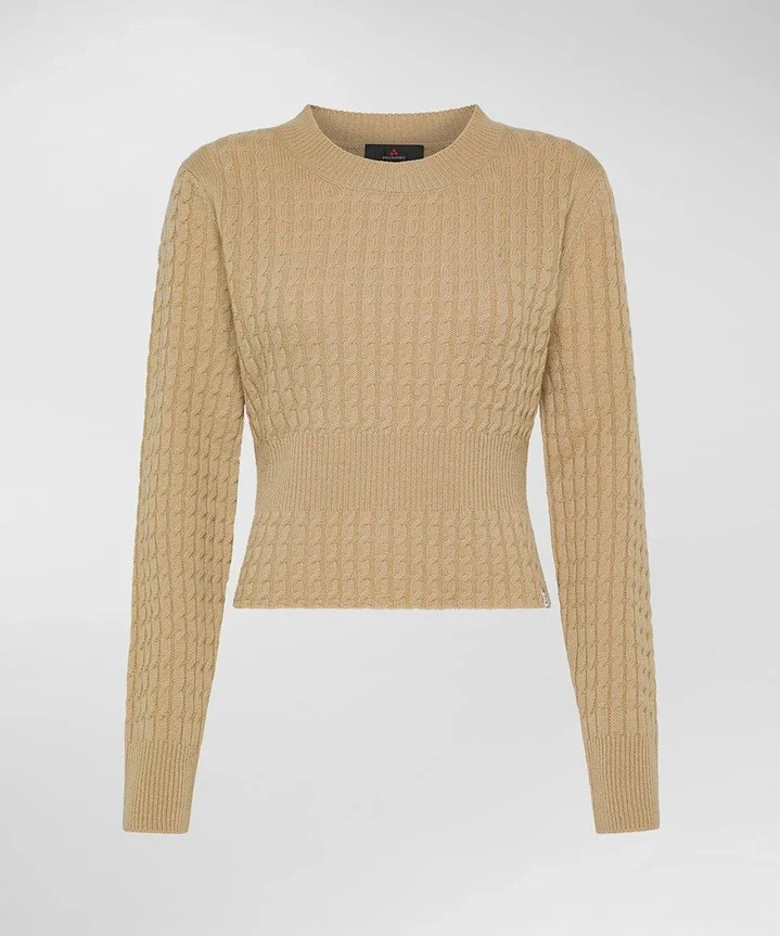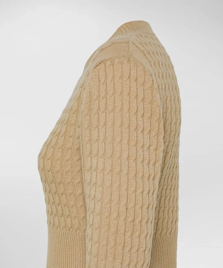 Maglia girocollo da donna beige in tricot di pura lana cardata, calda, morbida e piacevole al tatto. Il fit รจ avvitato e valorizzato da una fascia a coste che sottolinea il punto vita e valorizza la silhouette femminile. La lavorazione a trecce fitte su tutta la superficie aggiunge una nota di texture e movimento, mantenendo uno stile sobrio e ricercato. Un capo dallโeleganza essenziale, che evita la monotonia, ideale per aggiornare il guardaroba con un dettaglio sofisticato.