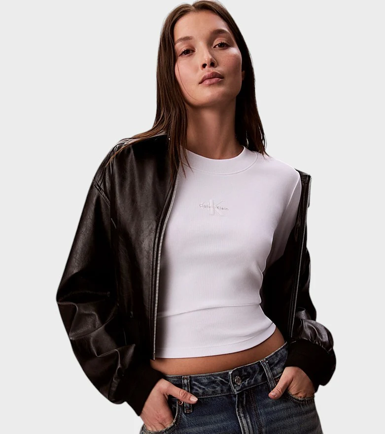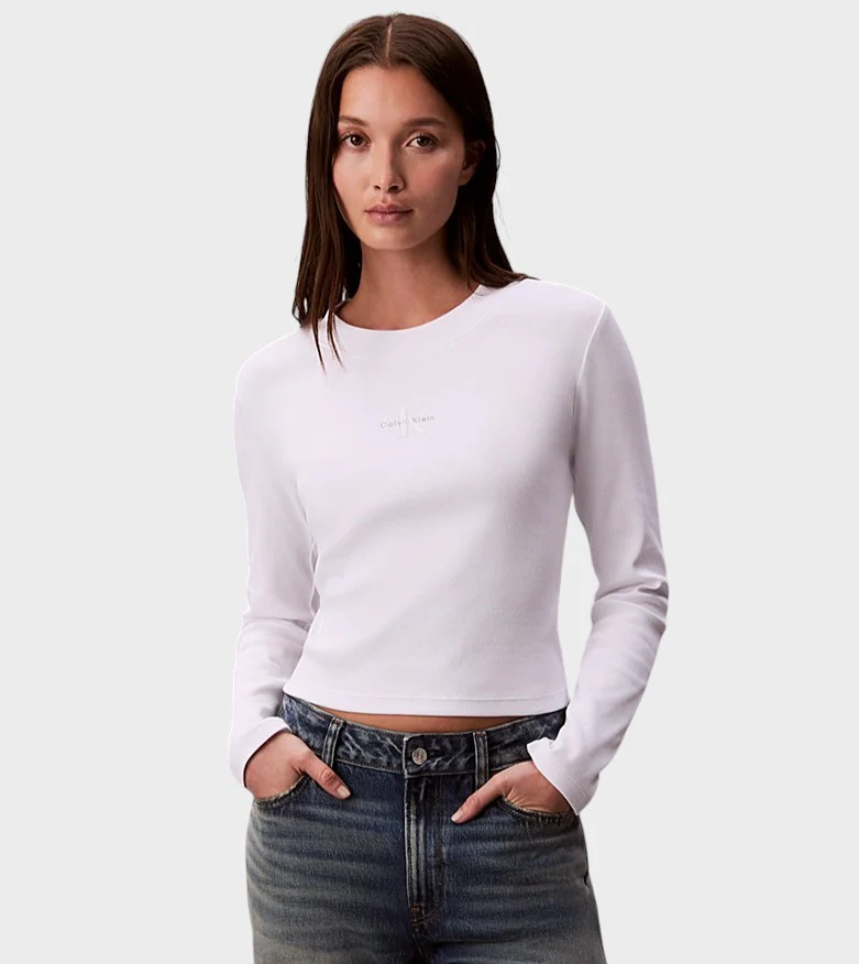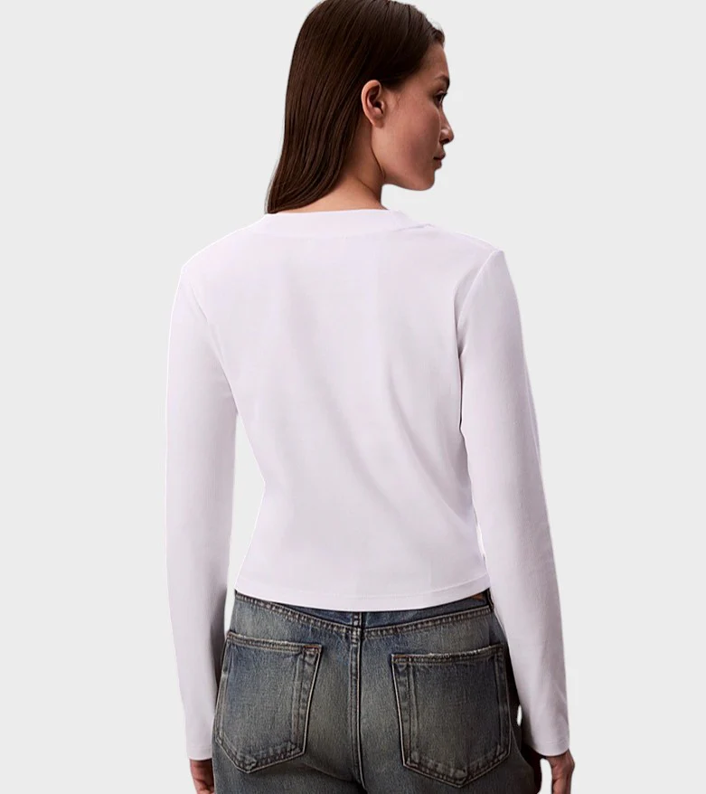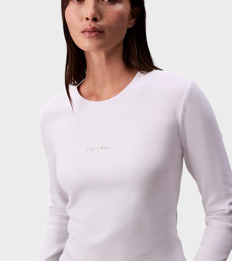 Maglia donna bianca realizzata in cotone elasticizzato, modello essenziale, girocollo e maniche lunghe con grafivรฌca monologo sul davanti.