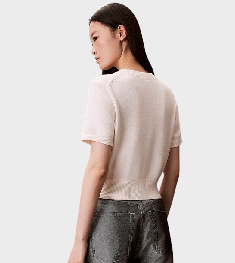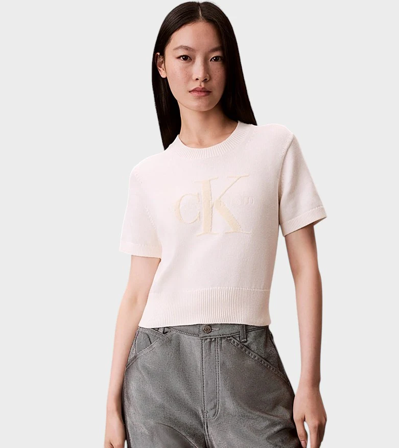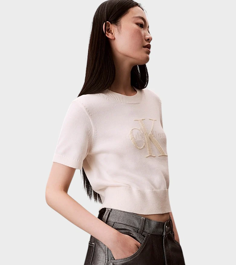 Maglia donna bianca realizzata in cotone, modello corto dal taglio regolare, girocollo, maniche corte e finitura a costine con grafica monologo sul davanti.