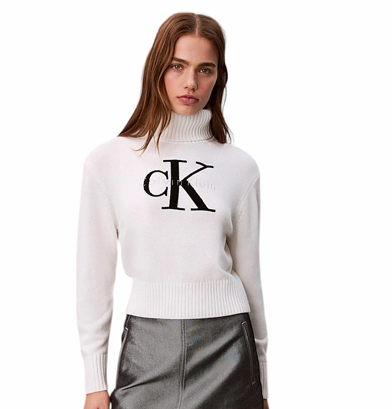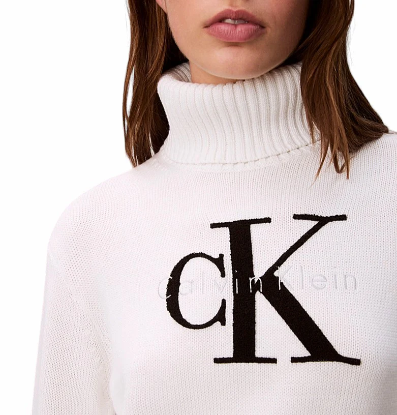 Maglia donna bianca in misto cotone, con morbida texture in ciniglia. Modello corto dal taglio regolare, con collo alto e logo sul petto.