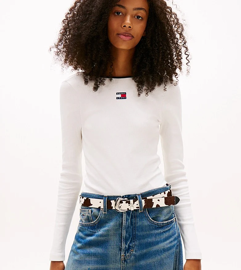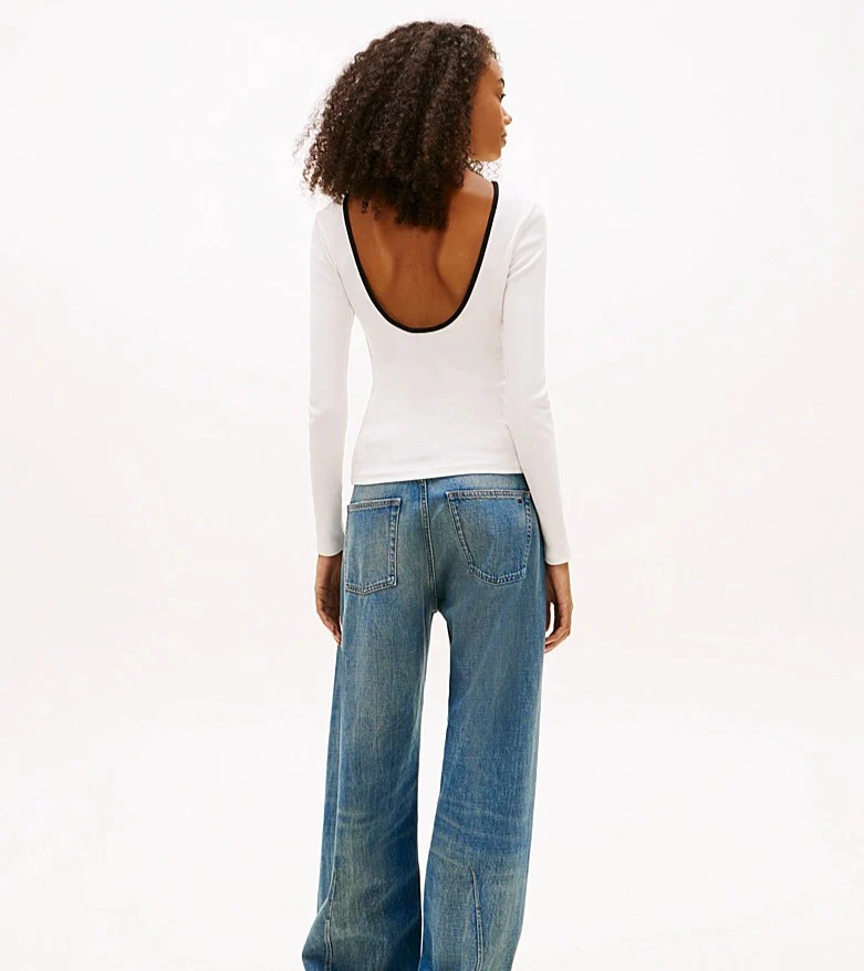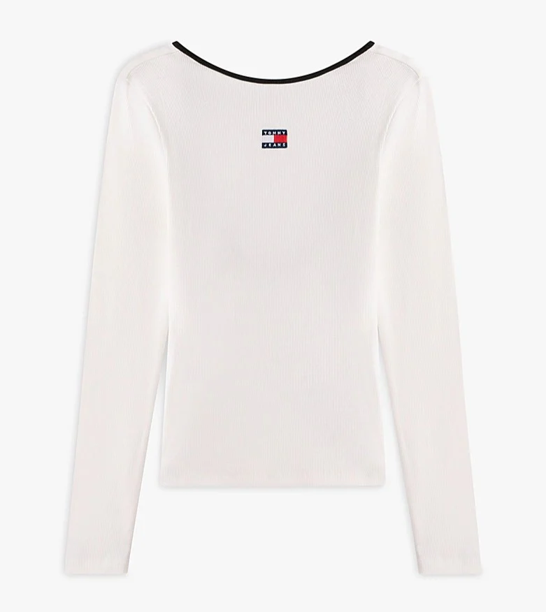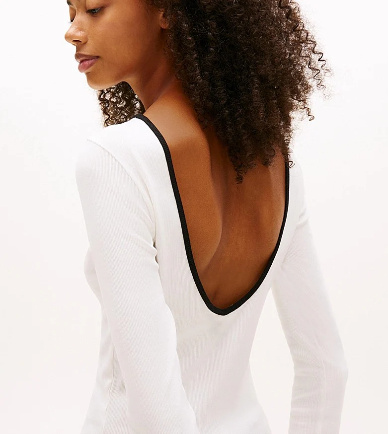 Maglia donna ecrù manica lunga, in cotone elasticizzato, tessuto a coste con collo rotondo e scollatura sulla schiena, con bordo a contrasto di colore, vestibilità elegante e aderente, con logo sul petto.