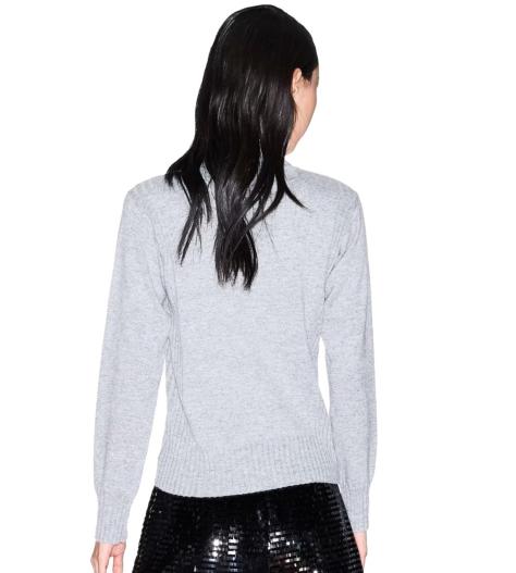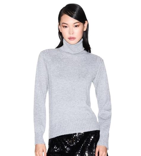Maglia da donna grigia realizzata in misto lana, modello con collo dolcevita, polsini e fondo lavorati a coste, cosi come i fianchi.