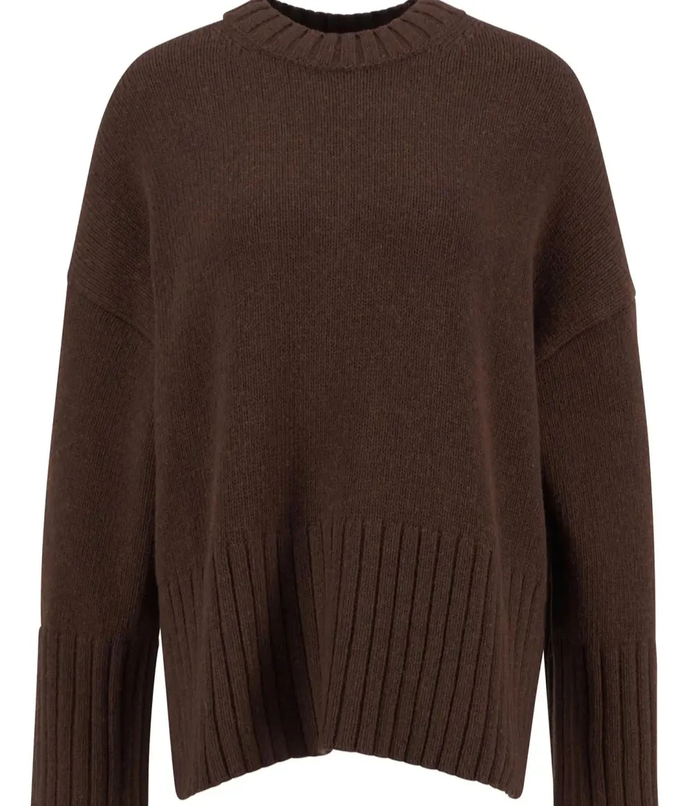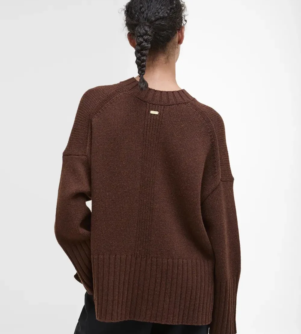 Maglione donna girocollo marrone in misto lana. I polsini e le finiture a coste accentuano immediatamente il profilo di questo maglione, mentre il misto cotone e lana assicura calore e comfort irresistibili a ogni utilizzo. Sottile barra metallica con logo sul retro del collo.