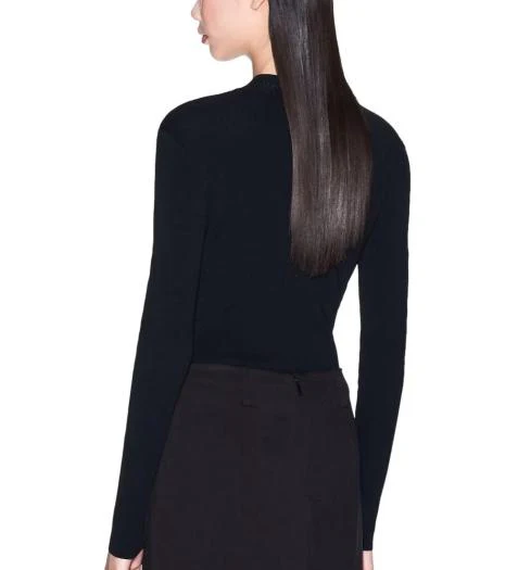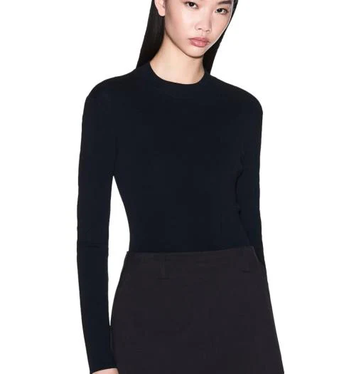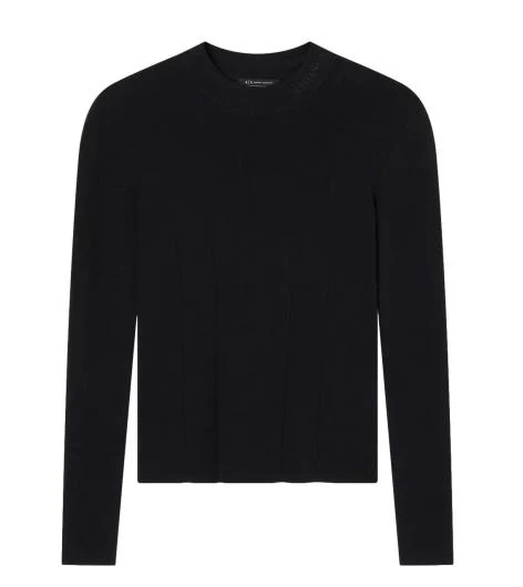 Maglia donna nera realizzata in misto viscosa, lavorata a coste verticali per un effetto modellante sul busto. Modello dallo scollo rotondo, maniche lunghe, lunghezza rogolare ai fianchi, dalla vestibilitร aderente, con discreto logo in rilievo sul retro del collo.