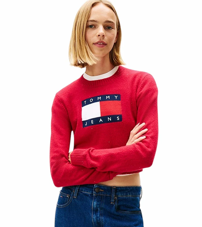 Maglia donna rossa in cotone, modello crop lavorato a maglia con paillettes scintillanti con audace bandierina sul davanti.
