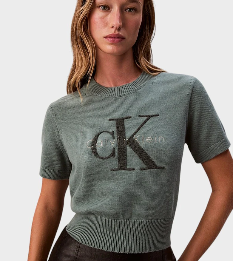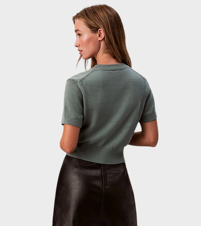 Maglia donna verde realizzata in cotone, modello corto dal taglio regolare, girocollo, maniche corte e finitura a costine con grafica monologo sul davanti.