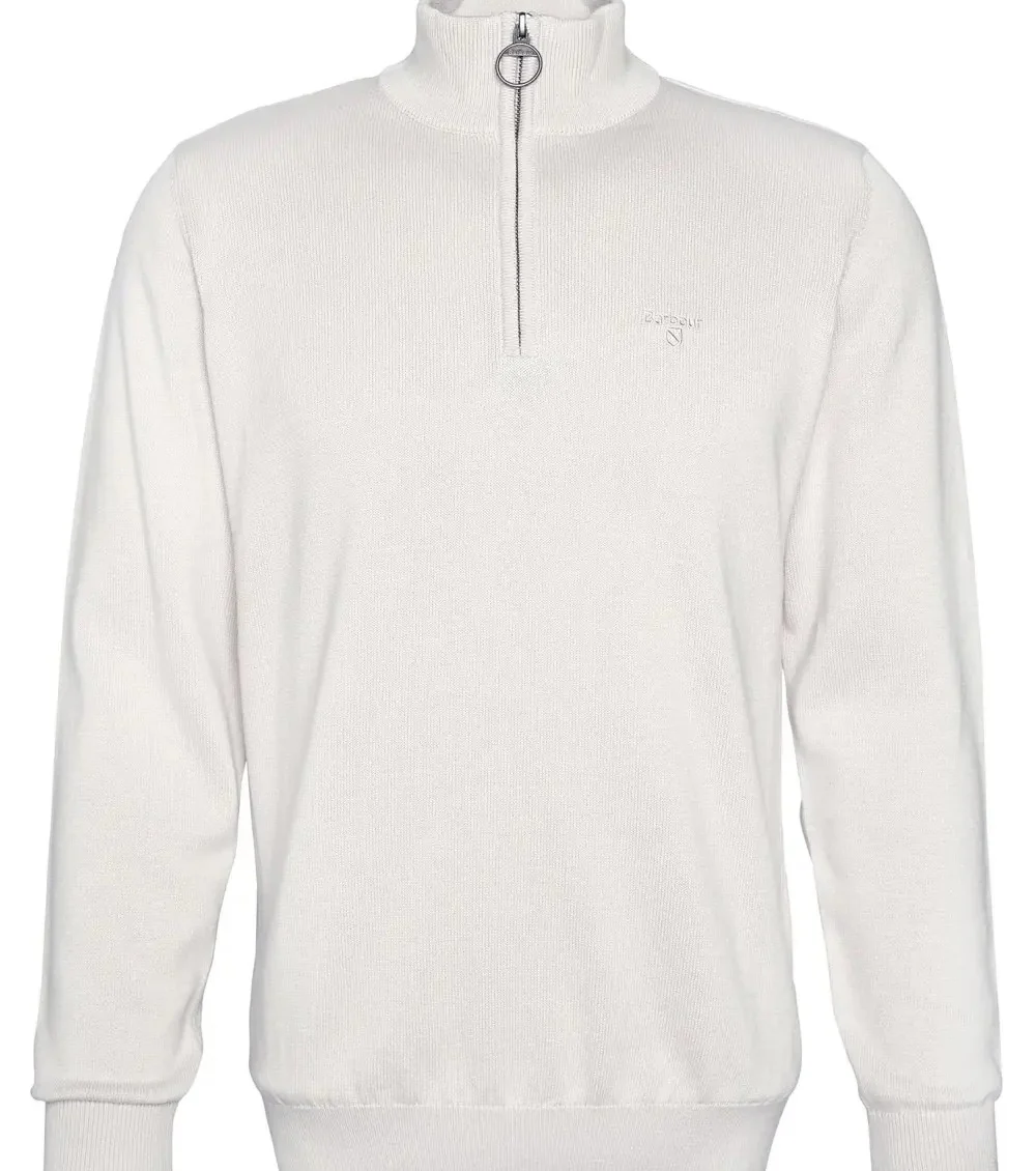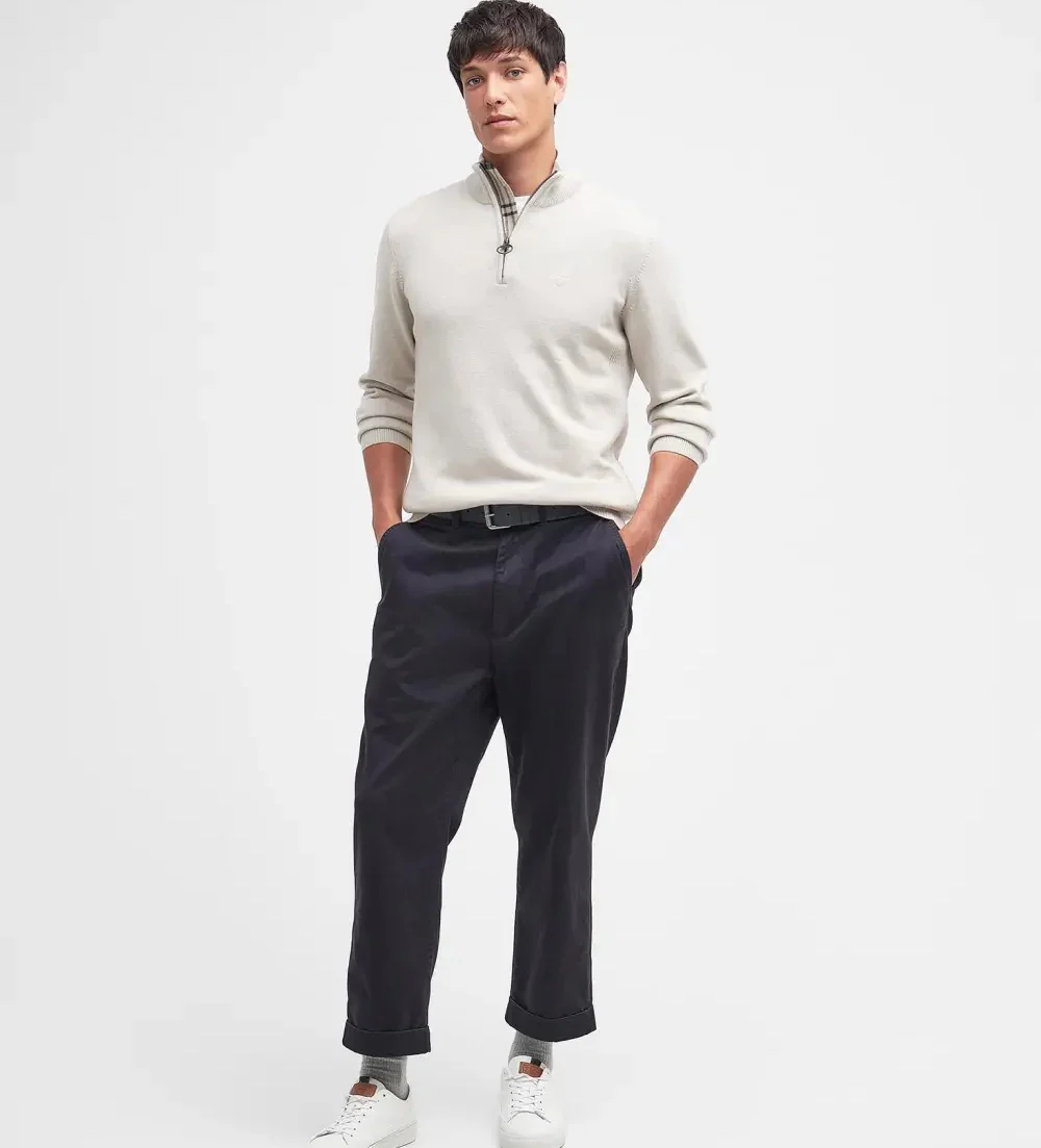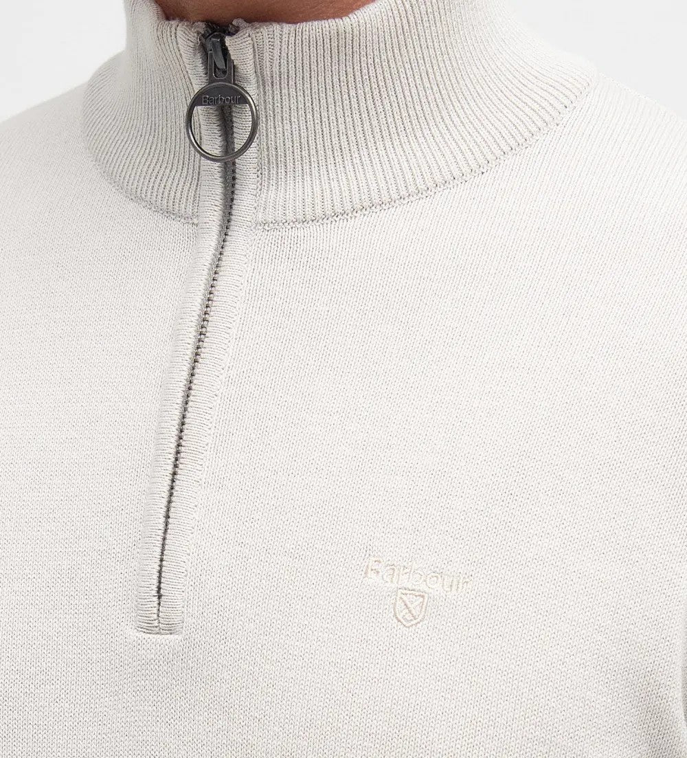 Maglia uomo beige in cotone, presenta un dettaglio a costine sul collo, sui polsini e sul pannello laterale che gli conferisce uno stile casual. Il maglione รจ rifinito da un dettaglio tartan sulla chiusura con zip e dal logo ricamato sul lato sinistro del petto.