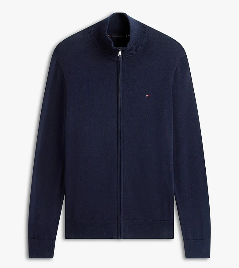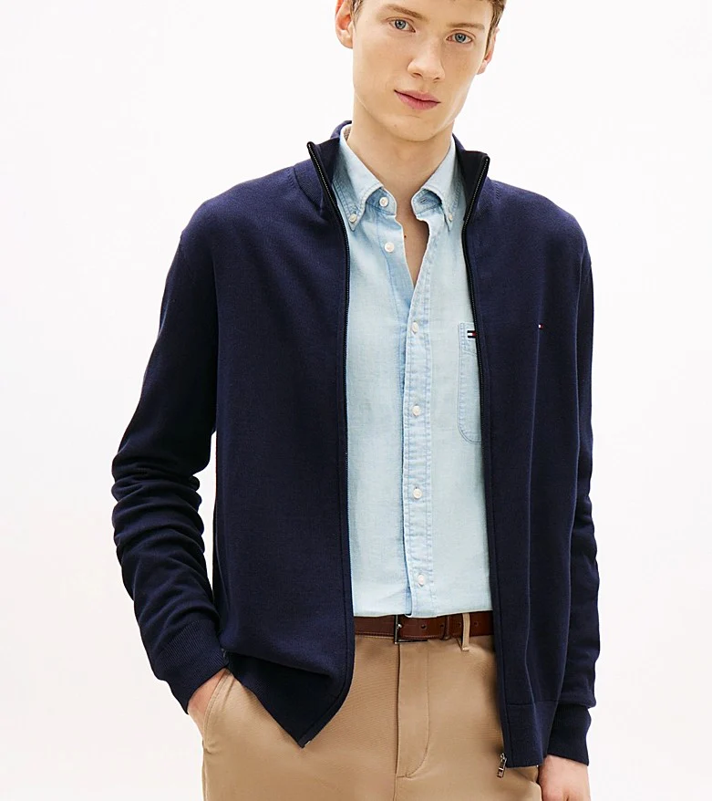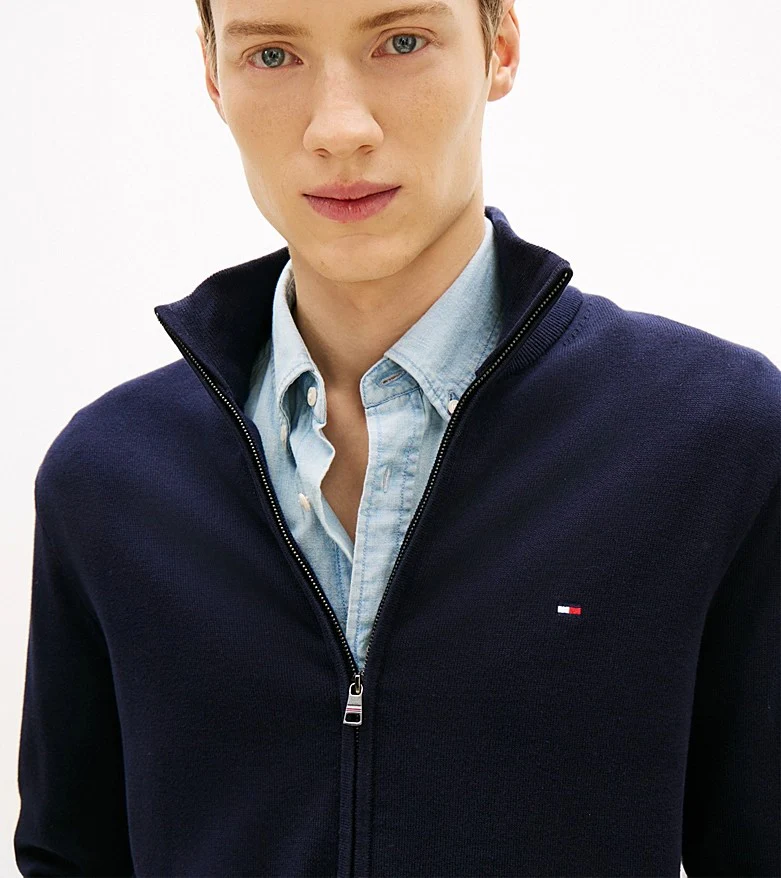 Maglia uomo blu in puro cotone pettinato, modello con zip integrale e collo a lupetto, dalla vestibilitร regolare, con bandierina ricamata sul petto.