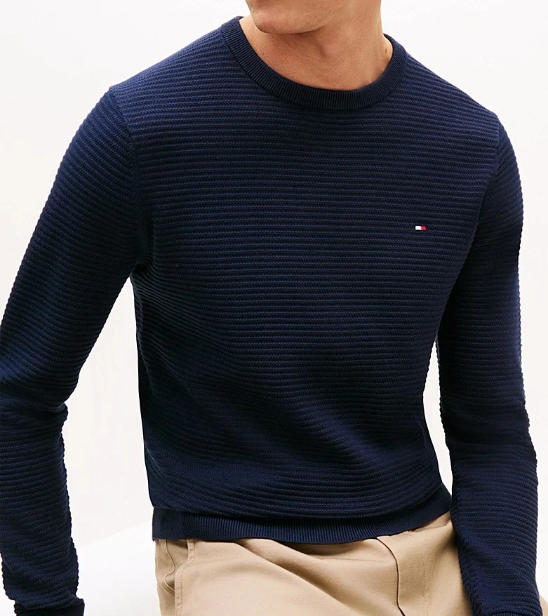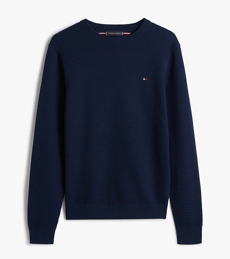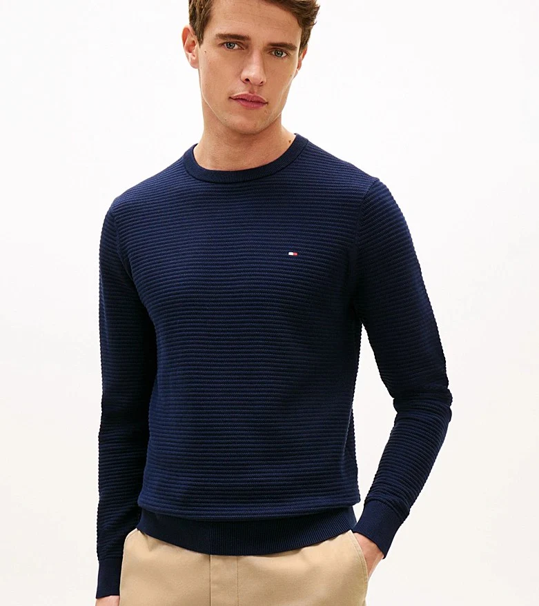 Maglia uomo blu in puro cotone pettinato, lavorata a maglia tramata, modello girocollo con collo, polsini e fondo a coste, bandierina ricamata sul petto. Vestibilitร regolare con spalle leggermente scese.