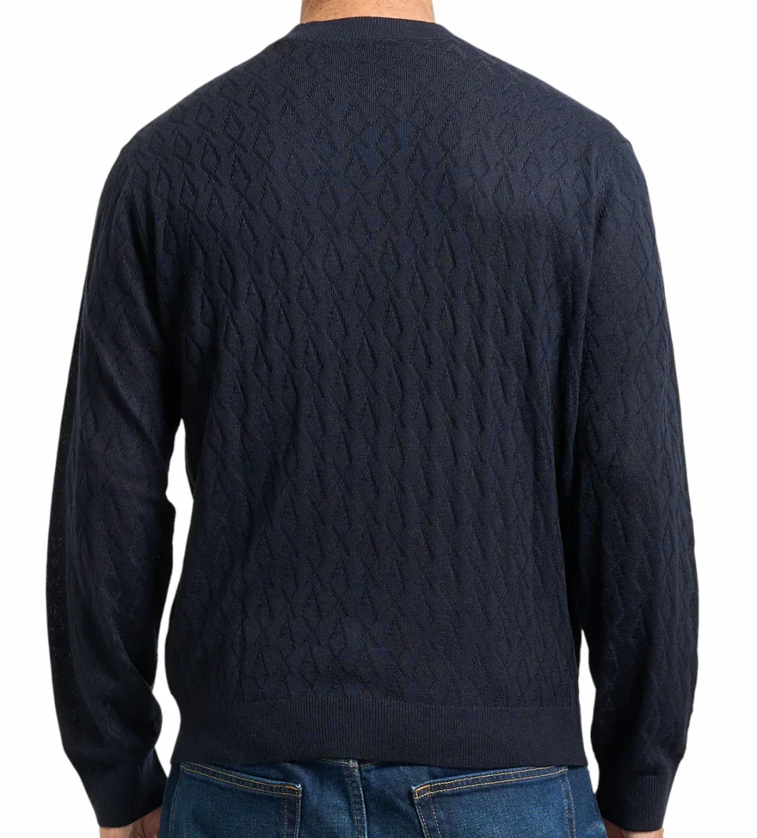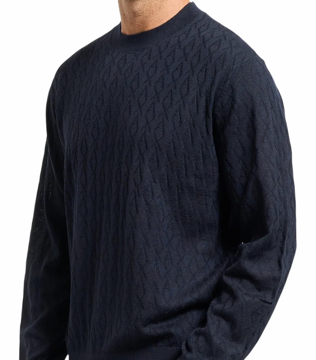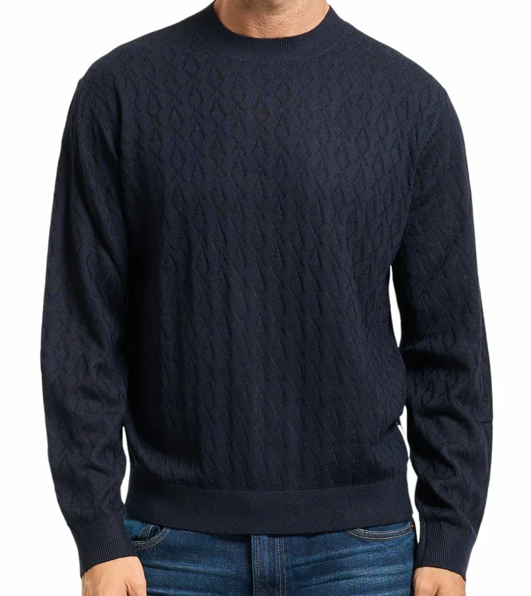 Maglione girocollo uomo blu in misto lana, caldo e confortevole. Presenta motivo a onde e finiture a coste. Completato da etichetta con logo.