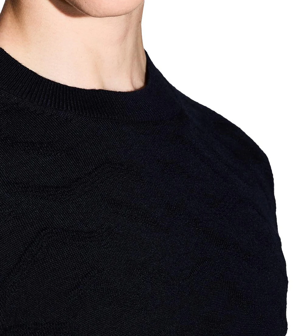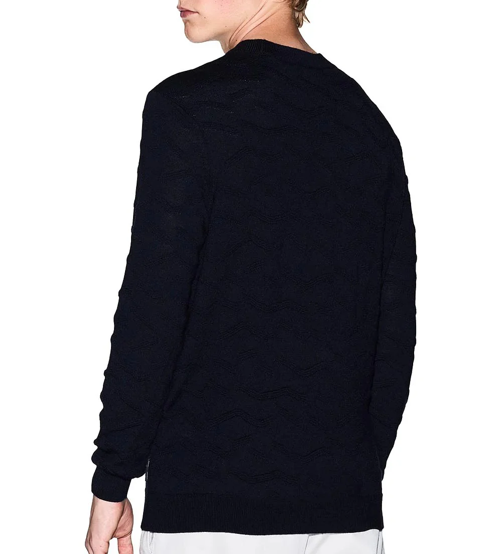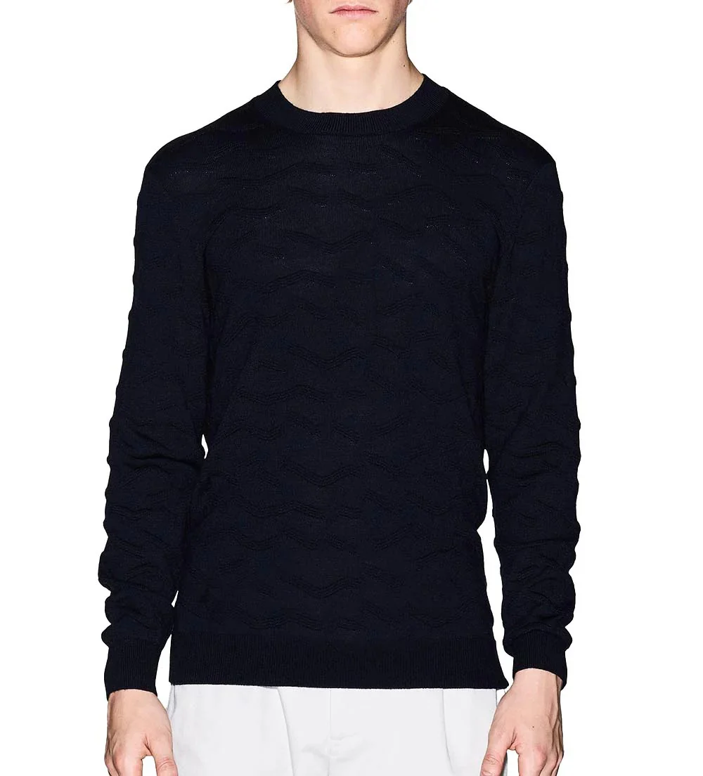 Maglia uomo blu realizzata in misto lana, modello girocollo e manica lunga, con collo, polsini e orlo a costine, dalla vestibilitร regolare; presente una lavorazione a texture ondulatache conferisce profonditร e carattere al capo.