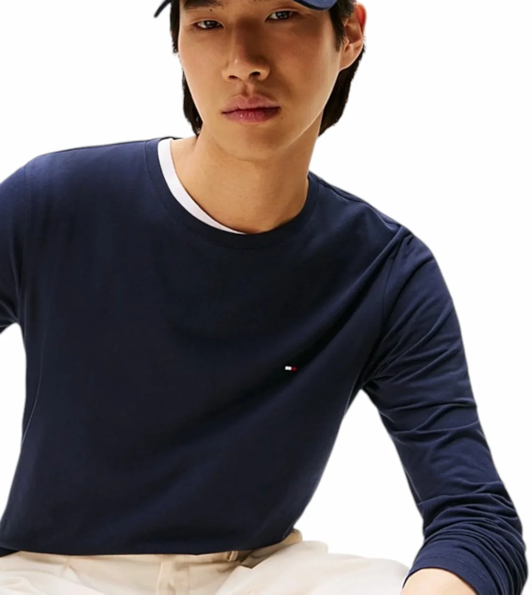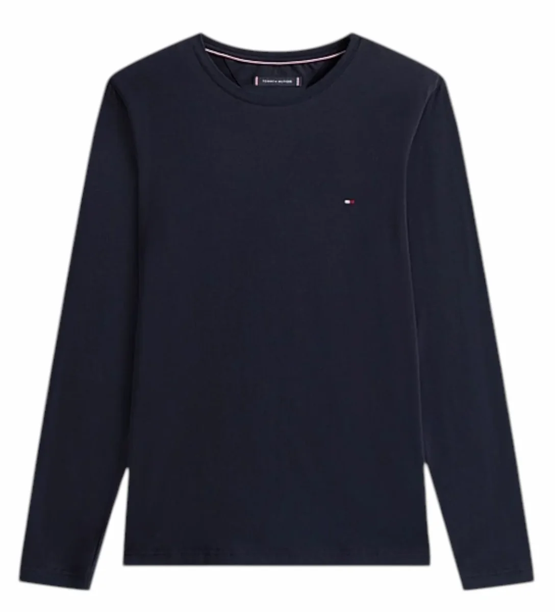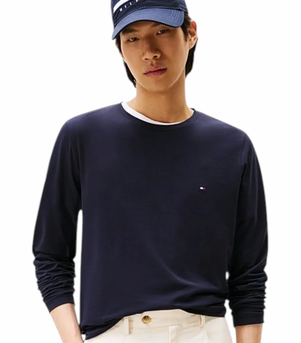 Maglia uomo blu navy in jersey di cotone biologico elasticizzato, dalla vestibilita aderente, girocollo, maniche lunghe e logo ricamato sul petto.