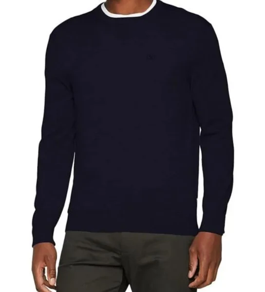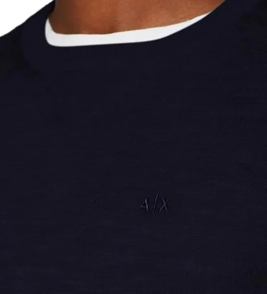 Maglia uomo blu navy in lana, girocollo manica lunga, con logo ricamato tono su tono sul petto.