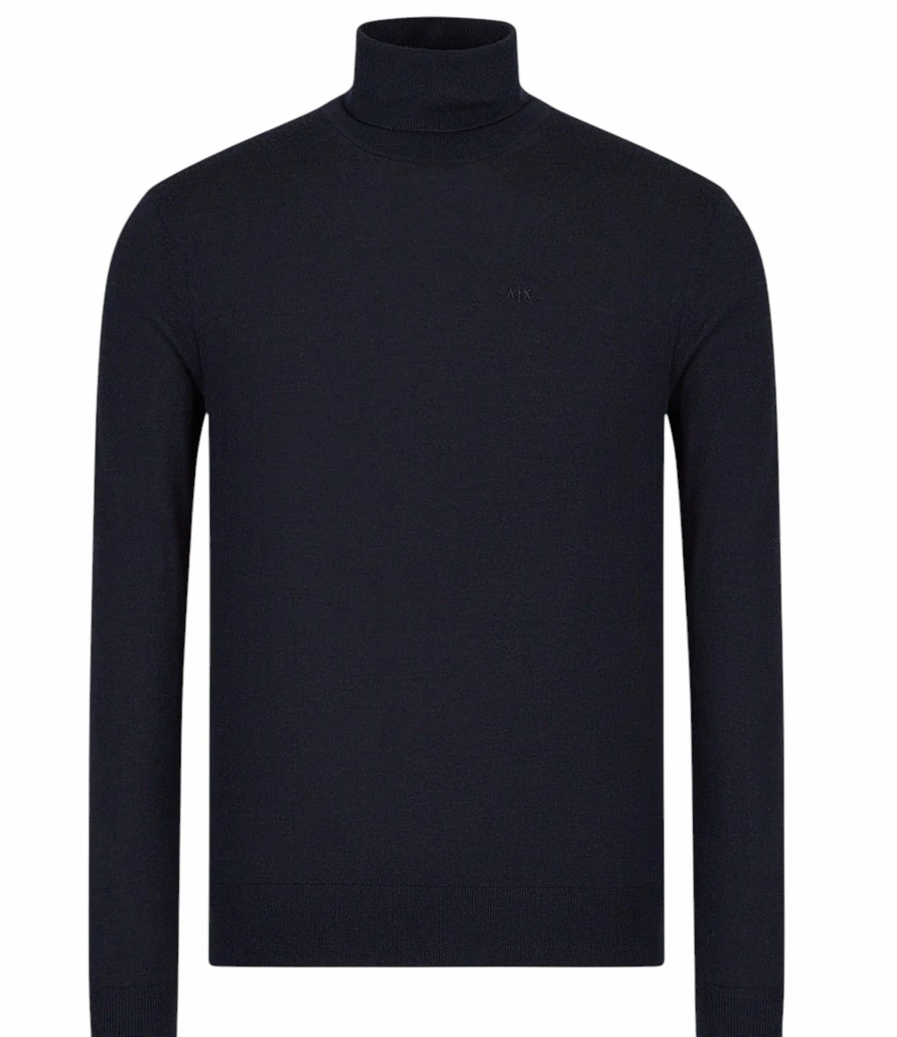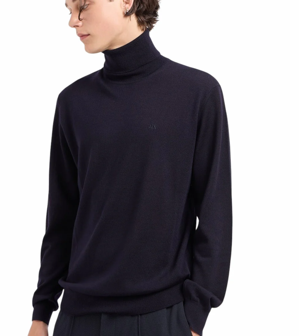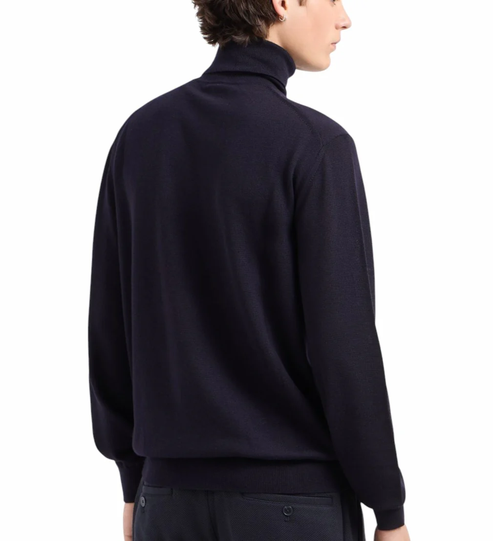 Maglia uomo blu navy a collo alto in pura lana vergine, dalla vestibilitร slim. Logo ricamato tono su tono sul petto.