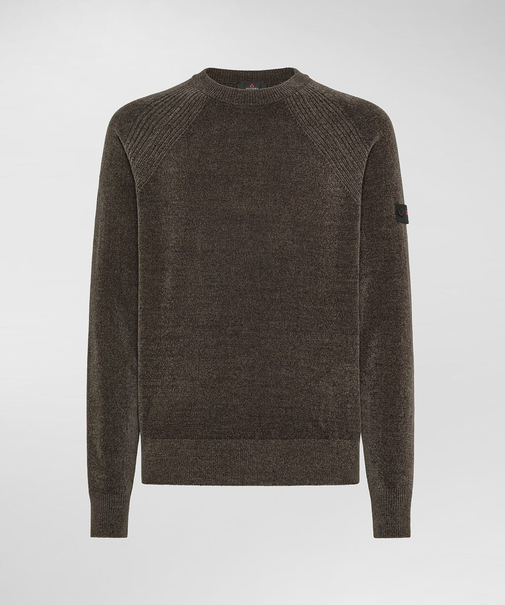 Maglia girocollo uomo cioccolato in tricot di morbida ciniglia rasata, caratterizzata da una superficie vellutata e una mano calda e avvolgente. I dettagli a coste su collo, polsini e vita definiscono la vestibilitร con eleganza. La personalizzazione con trilogy, logo iconico del brand, รจ applicata con discrezione sulla manica sinistra tramite bottoncini. Un capo classico, irrinunciabile nel guardaroba maschile, reso contemporaneo ed elegante dalla particolaritร del tessuto. Per un look casual e informale di qualitร .