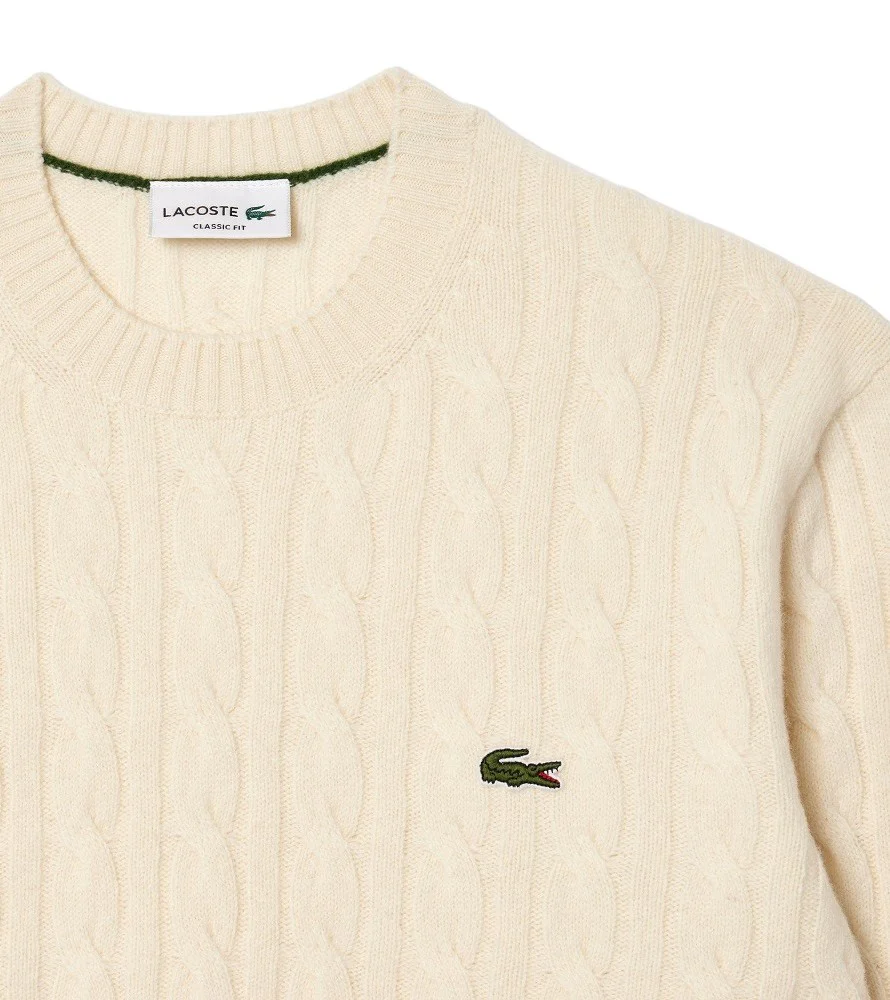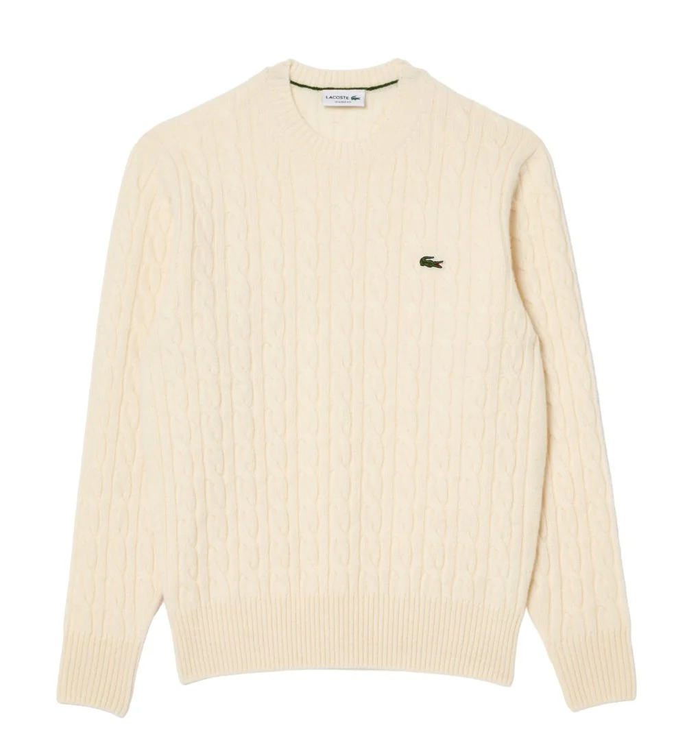 Maglia uomo panna realizzata in una spessa lana cardata, di origine animale, con dettagli a treccia per un risultato caldo e elegante. In aggiunta, dettagli sofisticati tra cui bande a coste profonde e un caratteristico coccodrillo ricamato sul petto. Maglia pesante finezza 7 con coste 5×5, dal comodo taglio classico con iconica striscia verde all’interno del colletto.