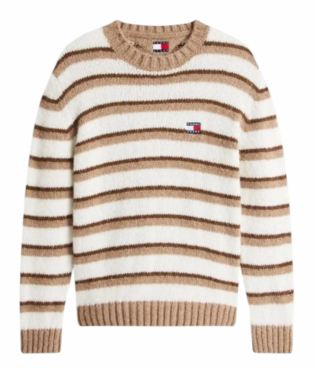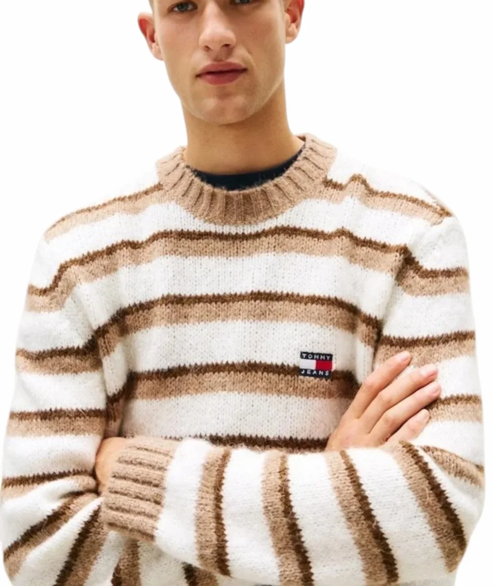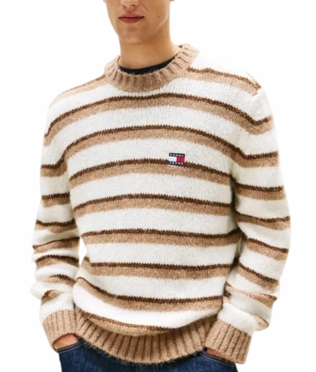 Maglione uomo beige, realizzato con filato di alpaca, la lussuosa texture di questo maglione esalta il suo audace design a righe, per un look moderno in maglia.Caratterizzato da righe orizzontali su tutta la superficie, girocollo. collo, polsini e orlo a coste, stemma di Tommy sul petto. Vestibilitร regolare