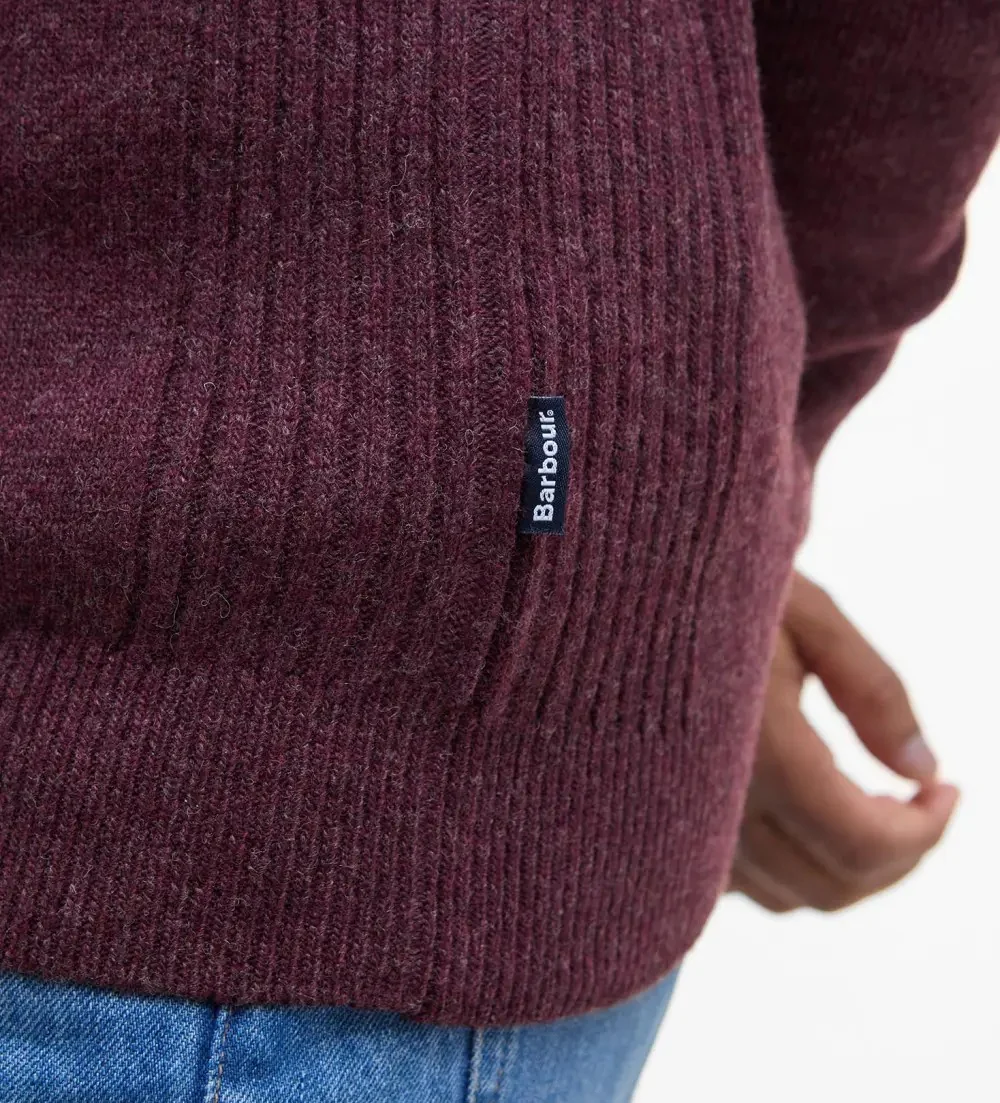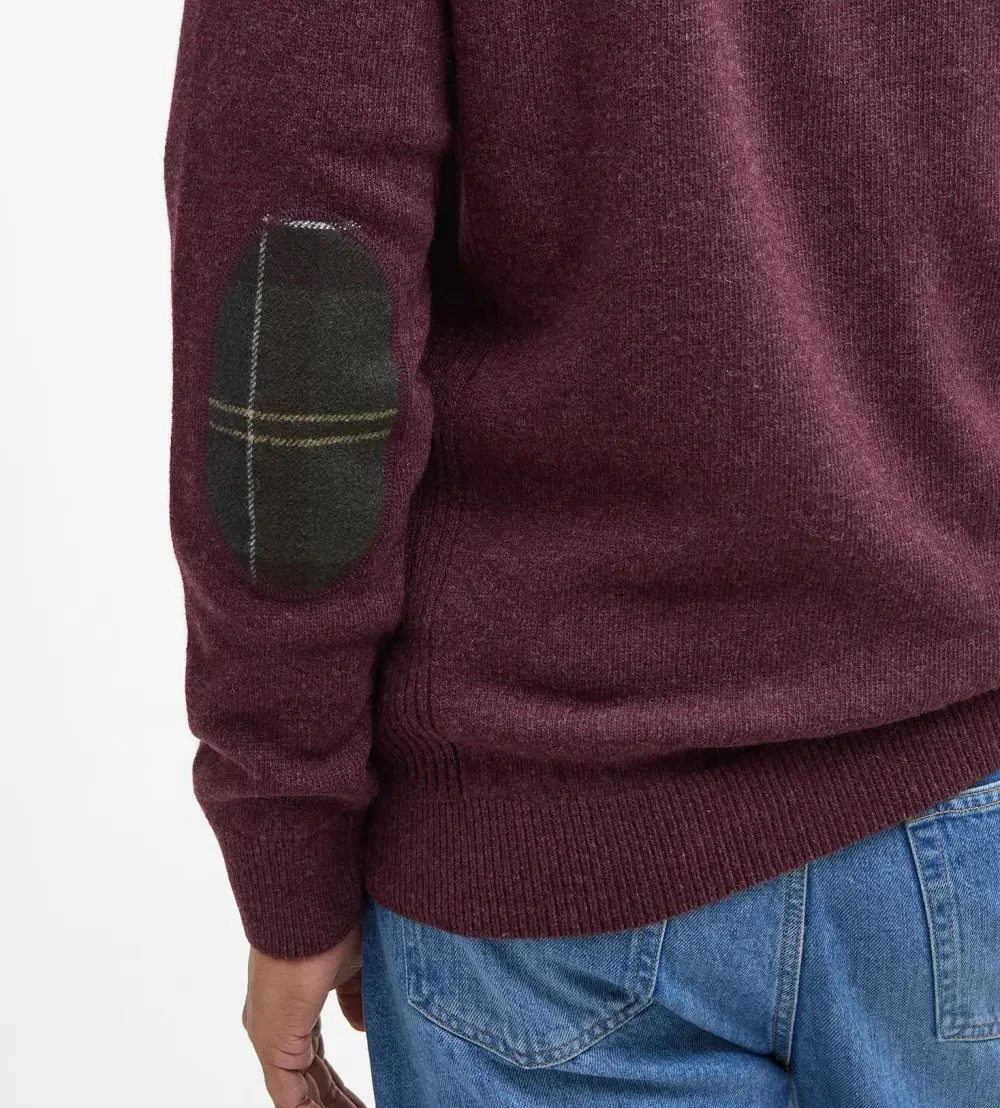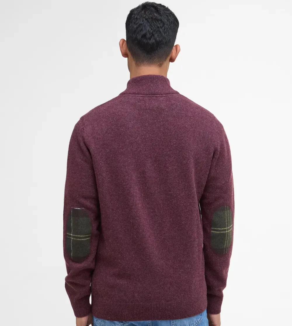 Maglione da uomo bordeaux elegante e versatile, realizzato in pregiata lana d’agnello. Questo caldo maglione รจ un capo ideale per la stagione invernale. Presenta giromanica completamente modellato e un comodo collo a imbuto a coste, che si chiude con una zip con marchio Barbour. I pannelli laterali a coste e le toppe sui gomiti a contrasto aggiungono dettagli discreti ma accattivanti.
