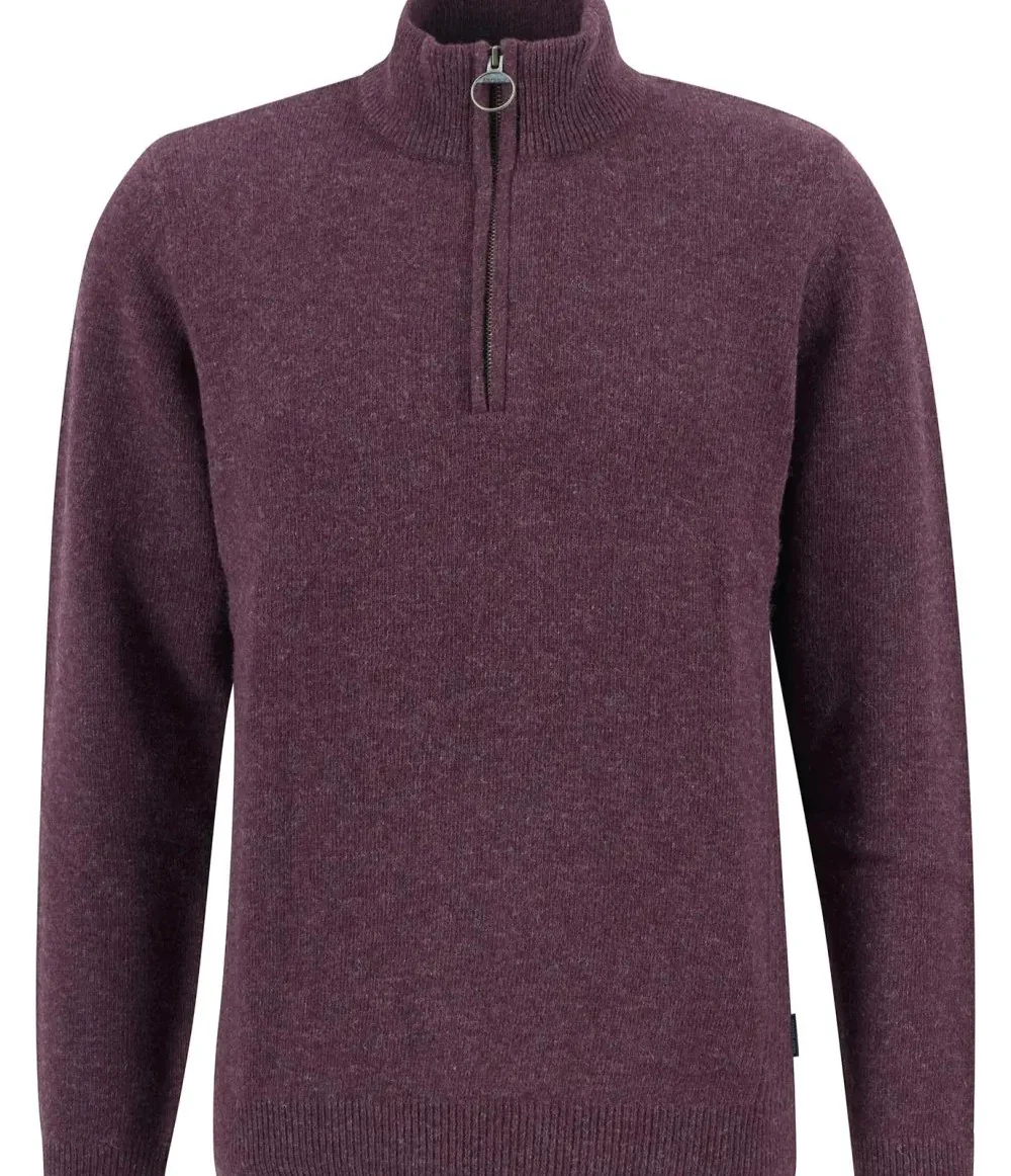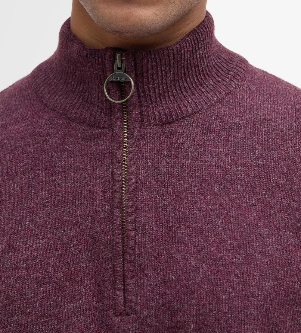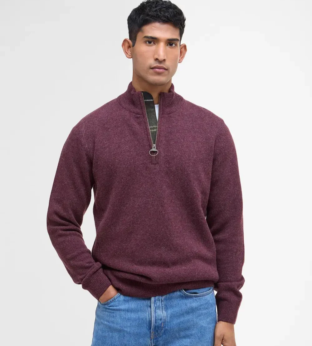 Maglione da uomo bordeaux elegante e versatile, realizzato in pregiata lana d’agnello. Questo caldo maglione รจ un capo ideale per la stagione invernale. Presenta giromanica completamente modellato e un comodo collo a imbuto a coste, che si chiude con una zip con marchio Barbour. I pannelli laterali a coste e le toppe sui gomiti a contrasto aggiungono dettagli discreti ma accattivanti.