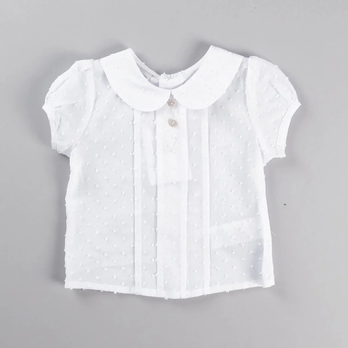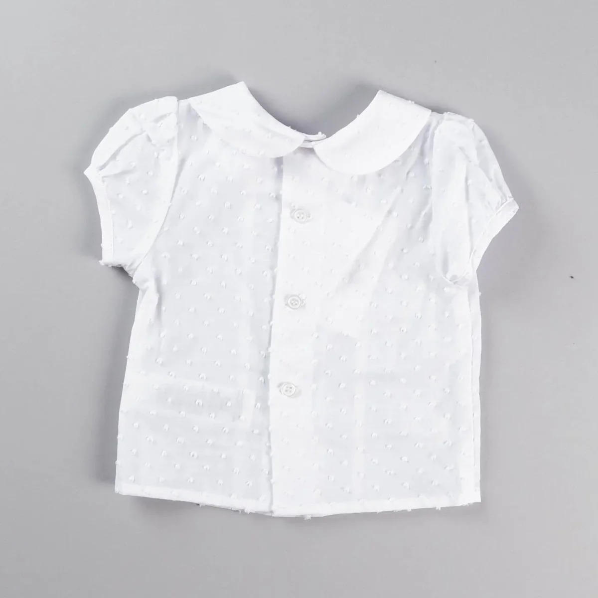 Camicia a maniche corte con abbellimento sul davanti. Chiusura sul retro con bottoni. Composizione: 100% cotone