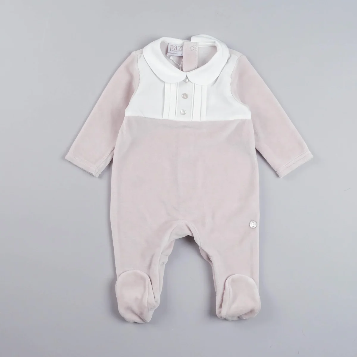 Tutina in ciniglia con piedini, colletto peter pan e inserto in cotone con bottoncini decorativi. Bottoncini a pressione sotto e sul retro. Composizione: 90% cotone, 10% poliestere