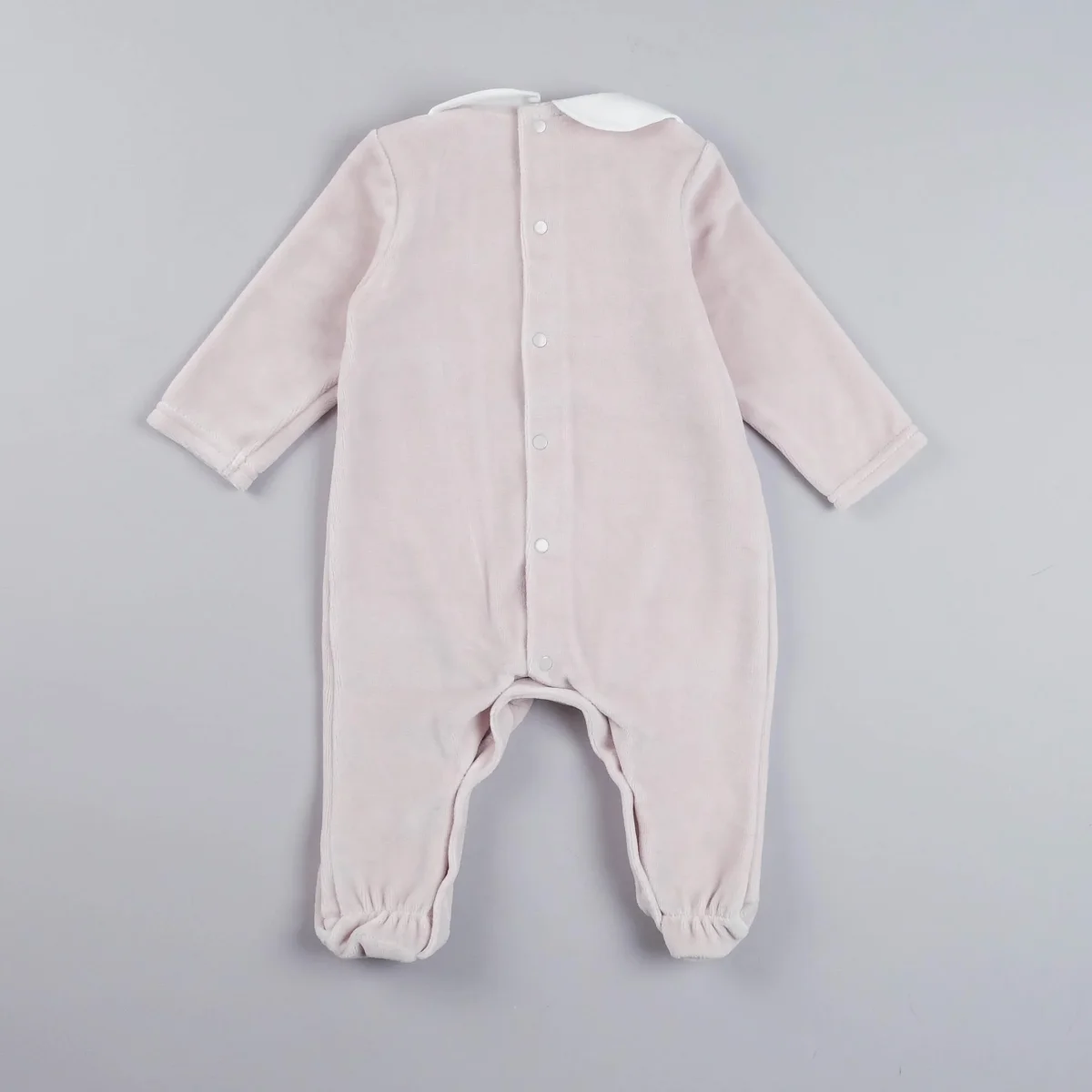 Tutina in ciniglia con piedini, colletto peter pan e inserto in cotone con bottoncini decorativi. Bottoncini a pressione sotto e sul retro.
