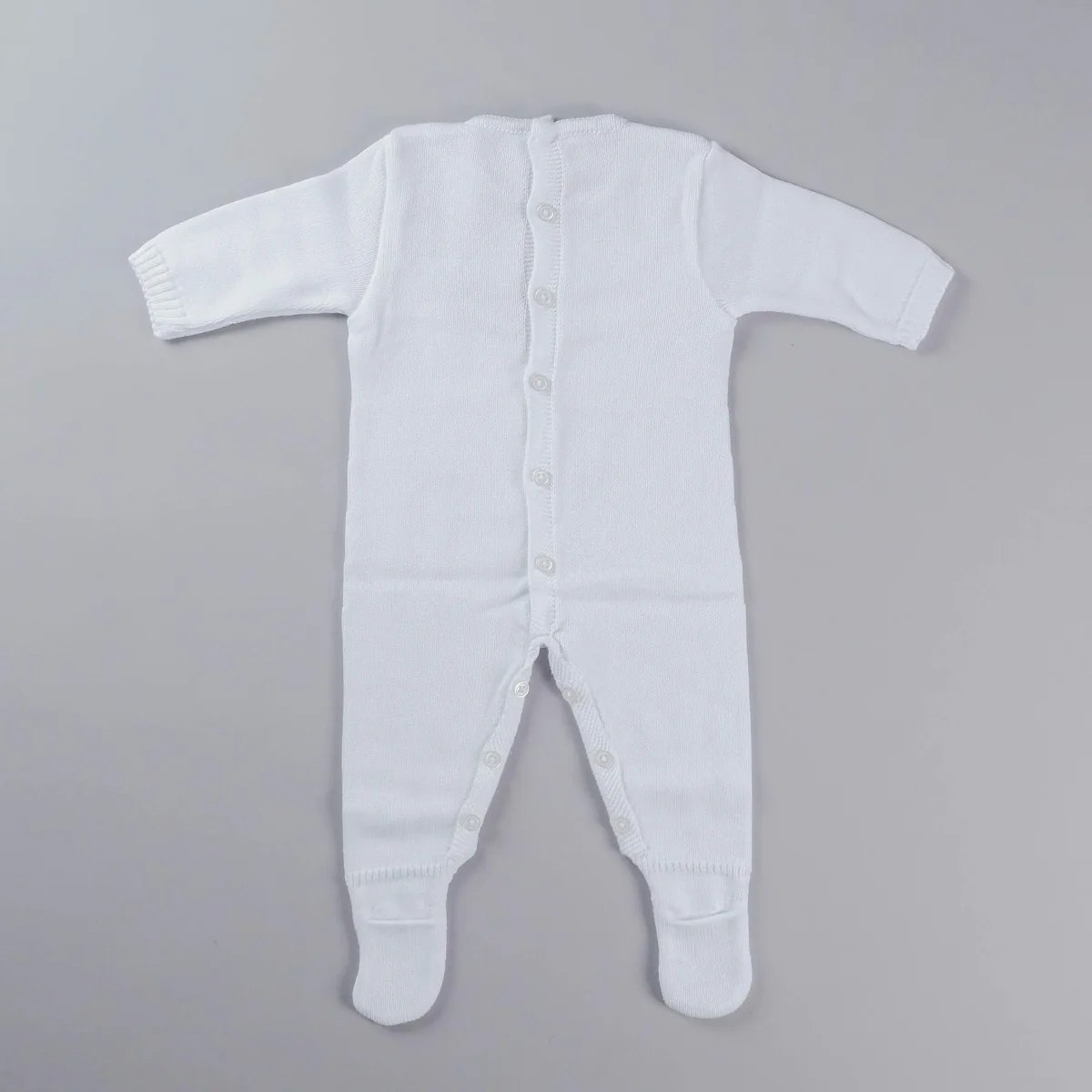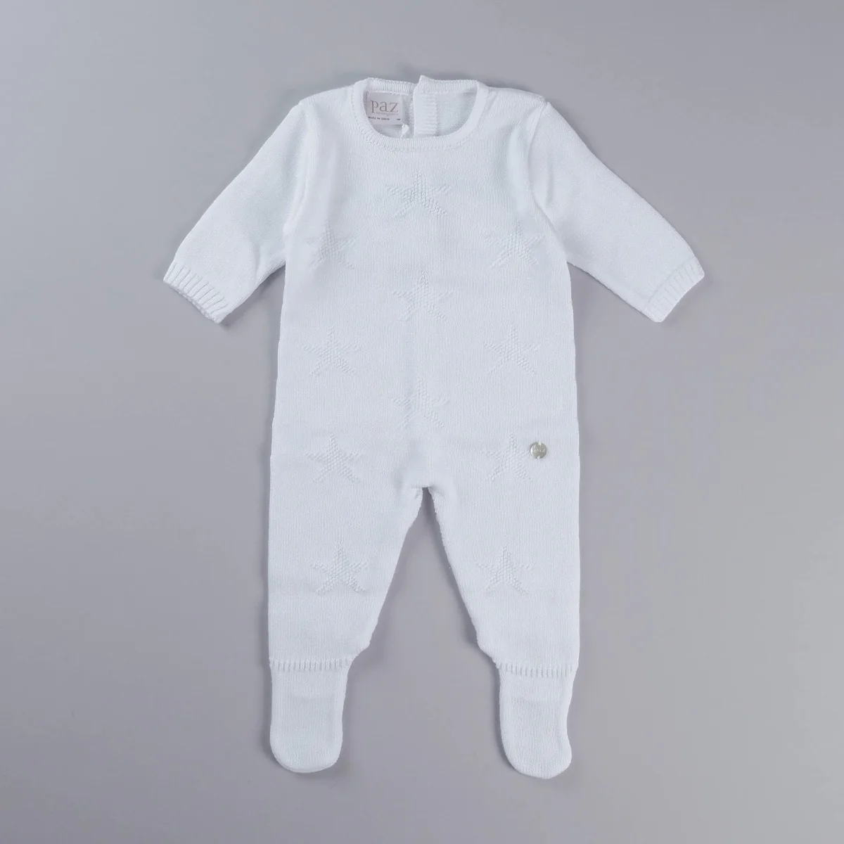 Tutina basic in maglia di puro cotone, stelle a intarsio, piedini e apertura sul retro e sotto tramite bottoni.