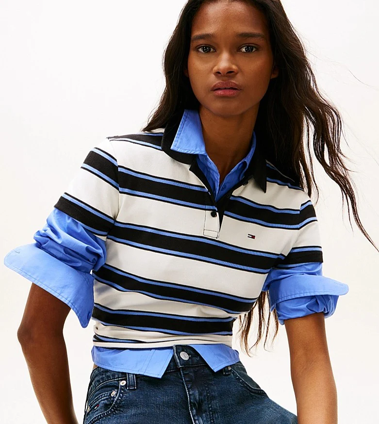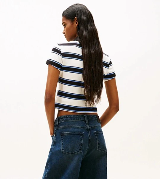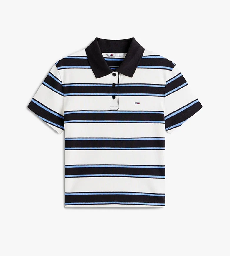 Polo donna a manica corta a righe ecrù/blu, in cotone elasticizzato. Il modello ha una linea cropped moderna, con colletto a contrasto, chiusura con bottoncini. Logo piccolo ricamato sul petto.