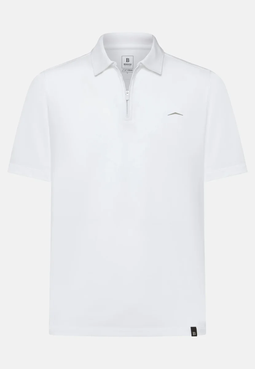 Polo B Tech in cotone e poliestere S.Cafรจยฎ ricavato da fondi di caffรจ riciclati. Asciugatura rapida, protezione UV e traspirabilitร , con zip personalizzata, ricamo B Sustainable e logo Boggi B per uno stile raffinato ed ecosostenibile.