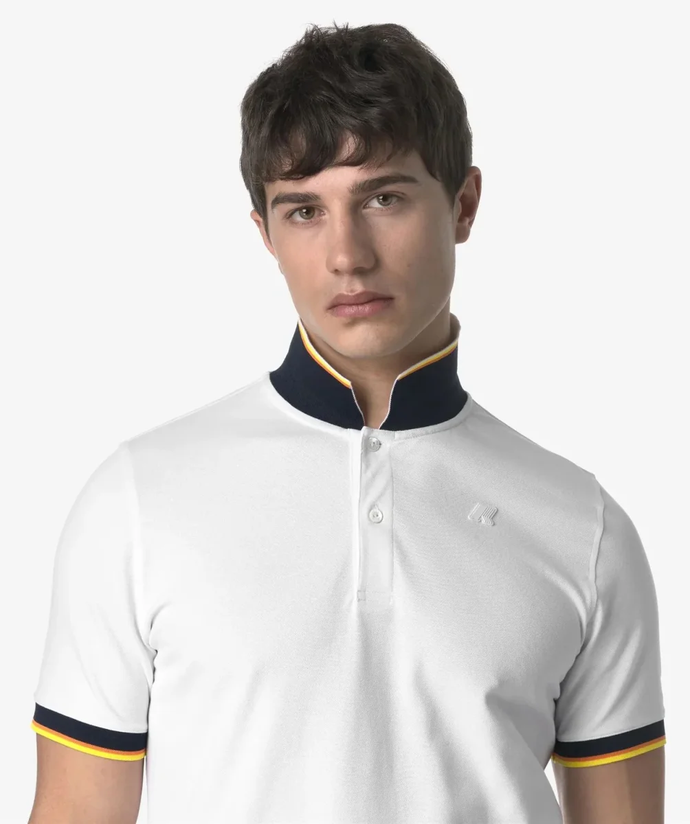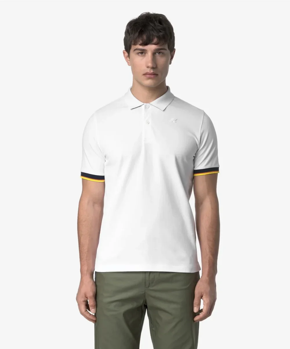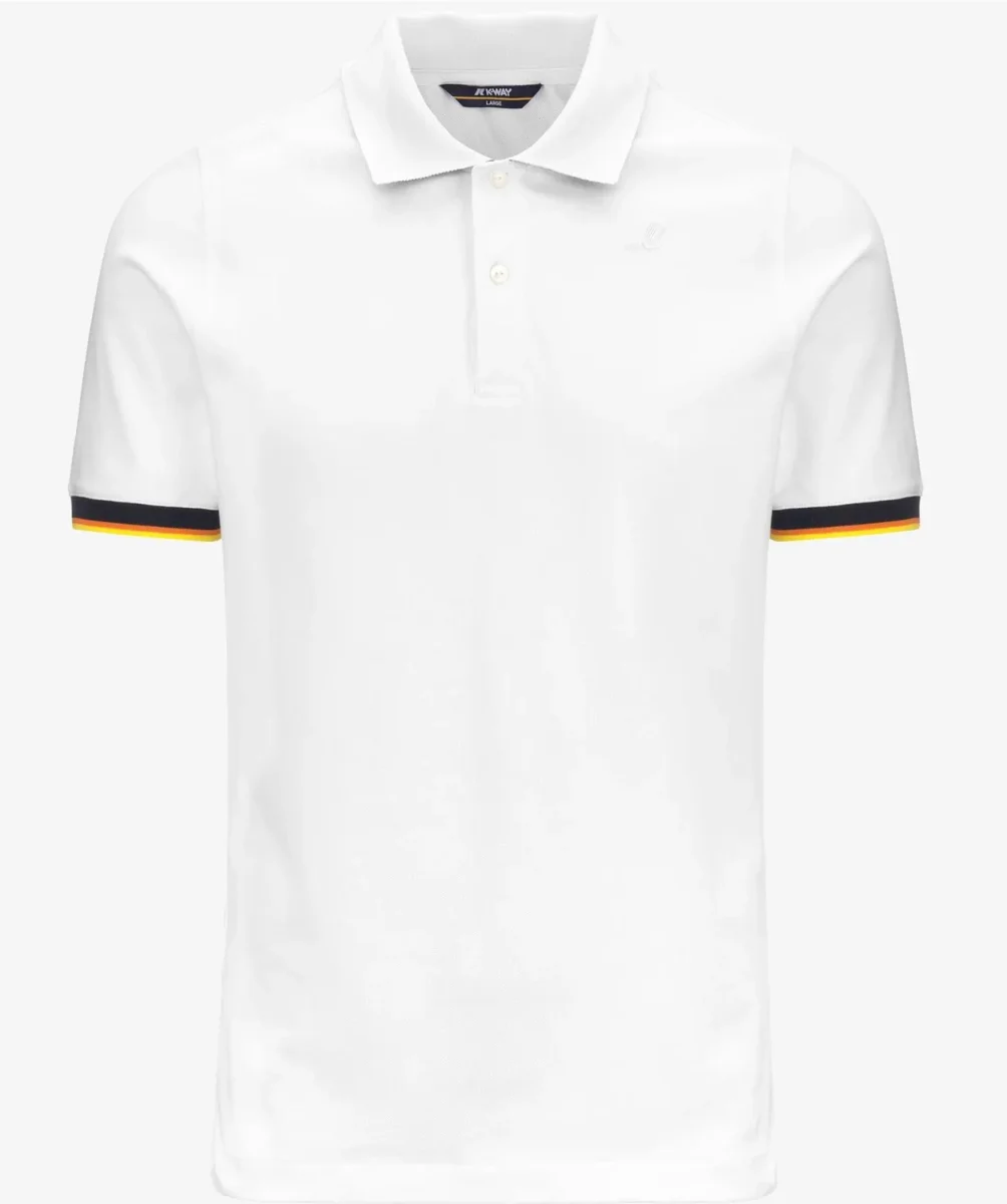 Polo uomo bianca in piquet di cotone stretch, รจ un capo dallโ€™eleganza funzionale che si adatta a qualsiasi look. Si caratterizza per i bordi delle maniche corte con profilo a righe nelle tonalitร  tipiche K-Way. Presenta spacchetti sui lati seguono i movimenti, tessuto piquet elasticizzato, collo e bordi in costina, sottocollo rigato, bordi rigati, finta a due bottoni personalizzati, logo in silicone bianco. Vestibilitร  slim.