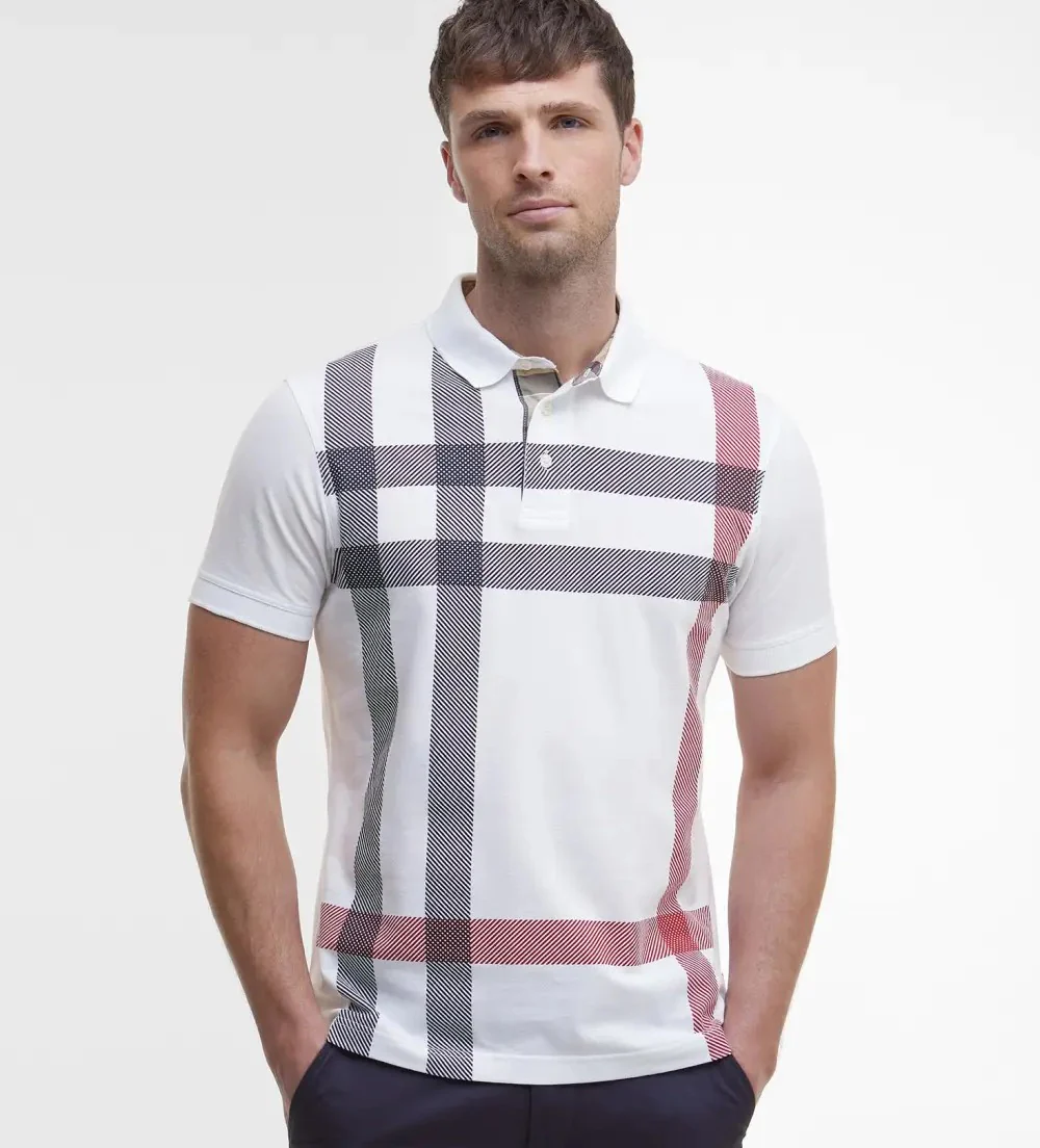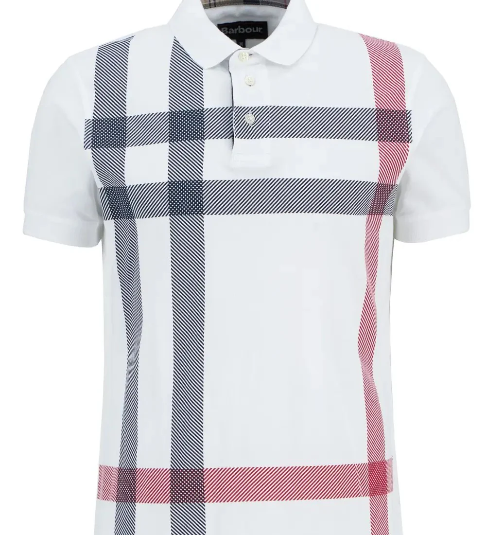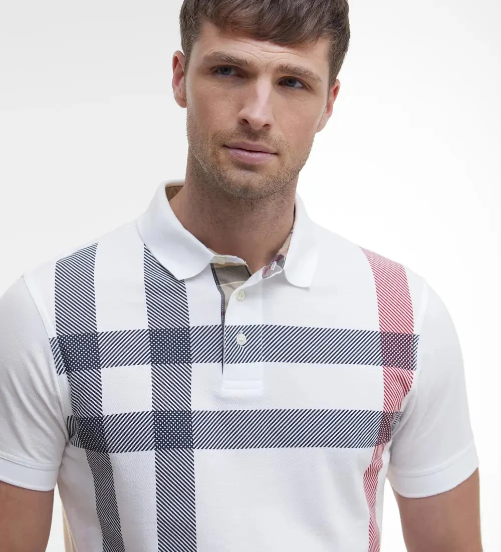 Polo uomo bianca in piquรจ di cotone, caratterizzata da un motivo tartan oversize e classici bottoni, รจ rifinita da colletto e polsini a costine e dettagli in tartan all’interno del colletto e dell’abbottonatura.