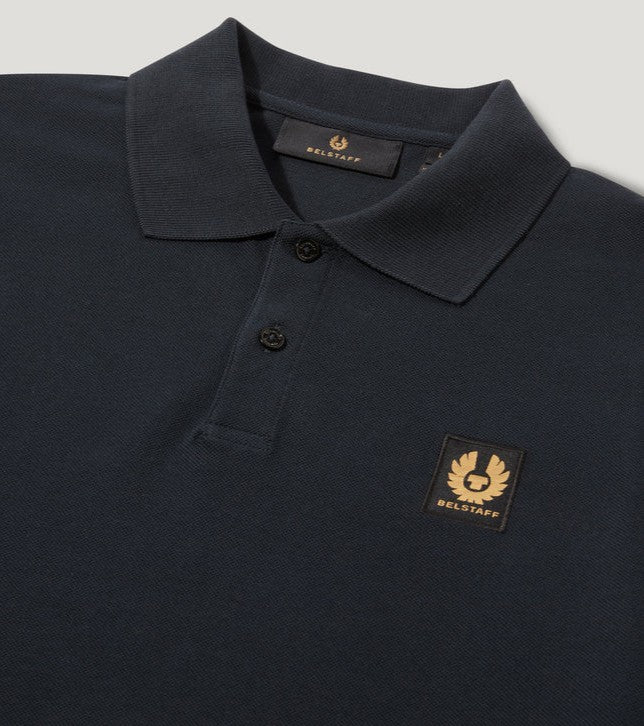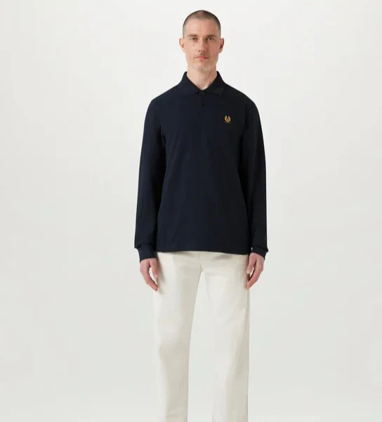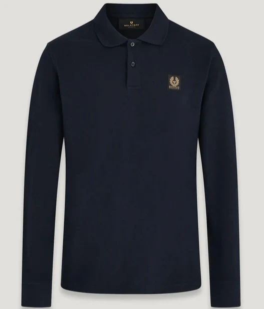 Polo uomo blu a maniche lunghe realizzata in piquรฉ di cotone testurizzato per maggiore struttura e traspirabilitร , colletto e polsini a coste, pattina a due bottoni e patch della fenice con bordo ricamato sul petto.